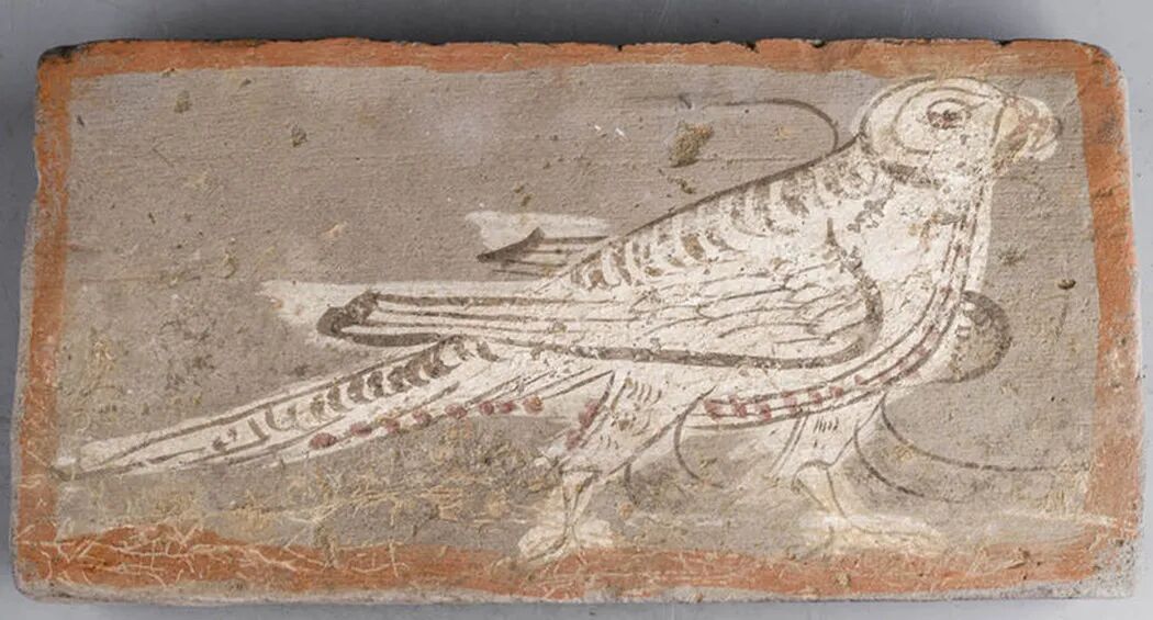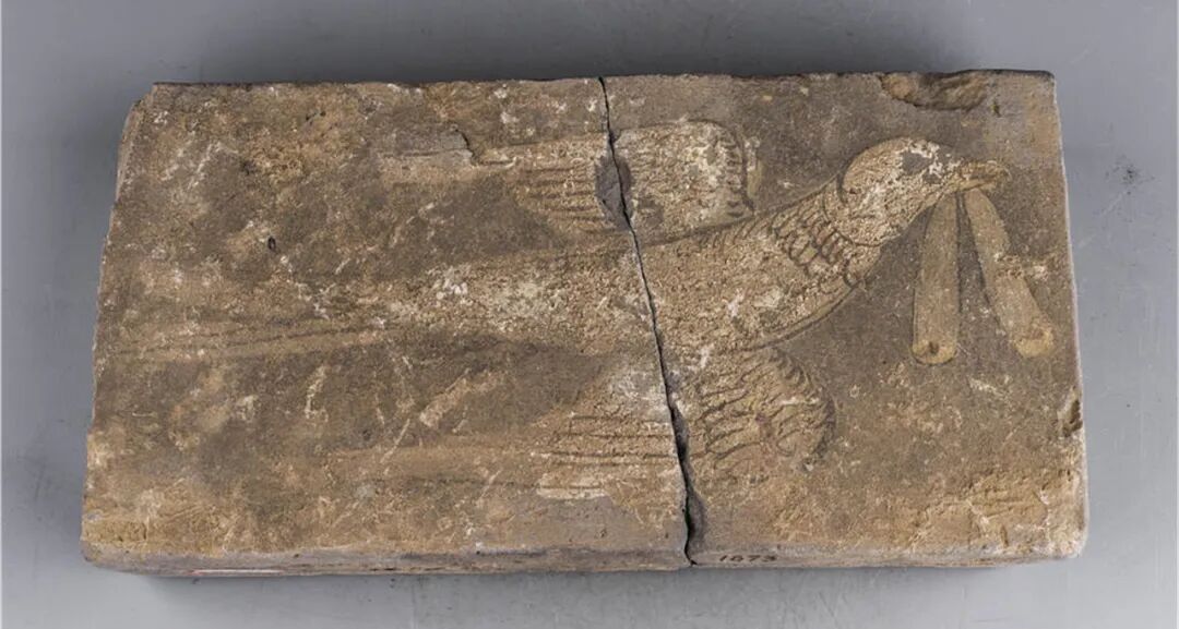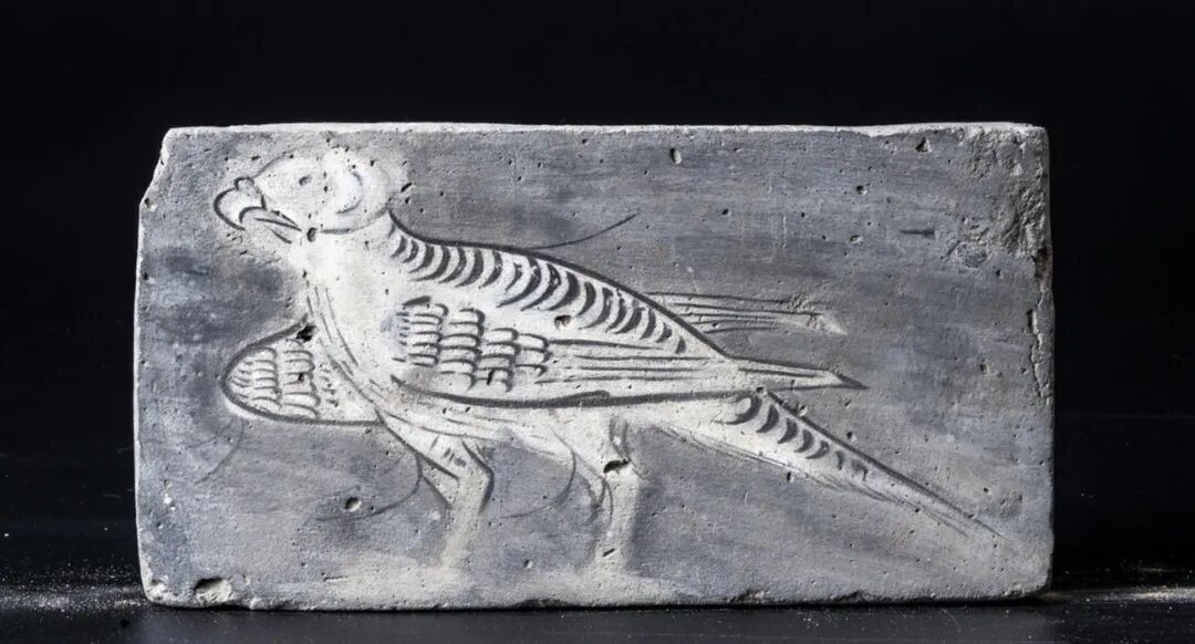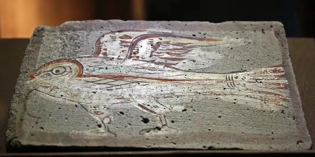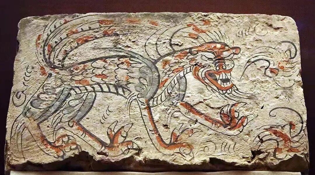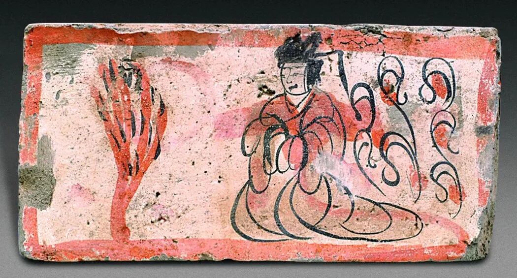 砖上所绘朱雀呈双足直立,行走姿态;头部有孔雀翎,长喙,两侧附有长须,张口作鸣啼状;长颈,双翅张扬,尾部亦带孔雀翎,向上翘起。姿态生动、优雅,极富美感。《楚辞》记载:“飞朱鸟使先驱兮,驾太一之象舆”,《山海经》记载:“有鸟焉,其状如鸡,五采而文……见则天下安宁。”朱雀常被视为祥和安宁的象征,其作为神山仙境的神鸟,也被用于象征天国仙境。