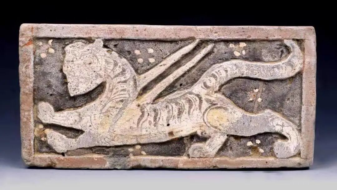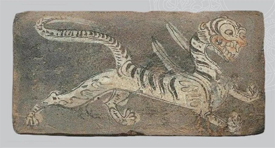 砖饰以黑色边框,框内墨绘白虎。白虎昂首怒啸,四足腾跃,双肩生羽翼,周身布环带状虎斑纹。