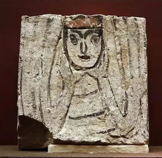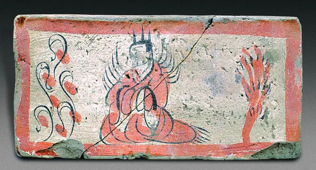画像砖用白色涂底,红色绘框,再用红色和黑色彩绘出图像内容。画面中央一女性人物端坐,头束高髻,似戴胜,双手拢于袖中,面对树状植物,背有云气,应为西王母。