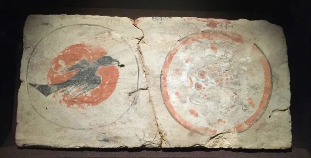 此画像砖将日月绘制于一砖,左侧为红日,中有金乌,右侧为圆月,中有蟾蜍。