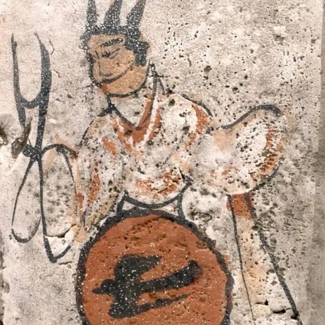 《山海经》曰:“沧海之中,有度朔之山,上有大桃木,其屈蟠三千里,其枝东北曰鬼门,万鬼所出入也。上有二神人,一曰神荼,一曰郁垒,主阅领万鬼。善害之鬼,执以苇索而以食虎。于是黄帝乃作礼,以时驱之,立大桃人,门户画神荼、郁垒与虎,悬苇索以御凶魅。”在古代,人们将神荼、郁垒及老虎奉为门神,并将三者的画像绘于门上,从而达到驱鬼避邪、镇宅避煞的效果,而在丧葬文化中,人们亦会将其图像绘于墓门上方的照壁底部、墓室壁面的拐角或是斗拱顶端,从而达到降服恶鬼的效果。