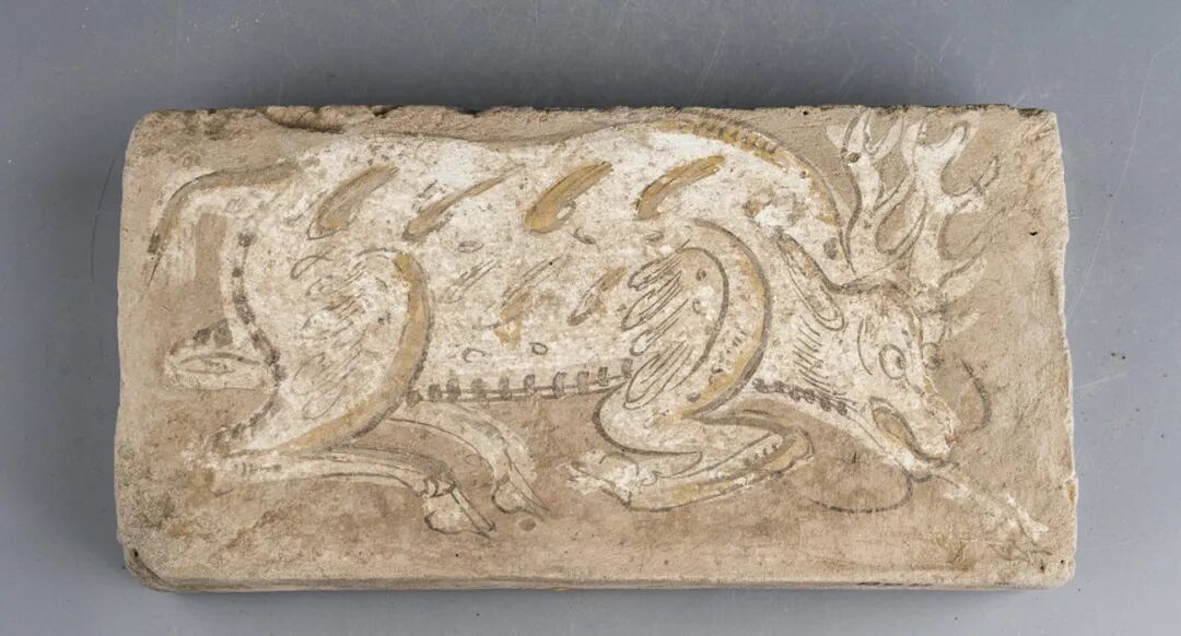 砖彩绘神鹿,双肩生翼,怒目圆睁,长耳长角,四肢长有羽毛,作奔驰状,身后云气涌动。神鹿表情生动,画面勾线清晰流畅,色彩鲜明。