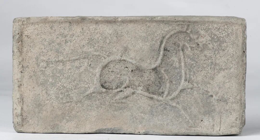 同类画像砖共藏有两块,砖上麒麟图造型大致相同,左右相对,置于墓壁两侧。所绘麒麟身披羽状鳞甲,兽首上扬,头顶剑状独角,与双耳呈“山”字形;怒目暴睛,张口嘶啸,身体屈作“S”状。四肢做奔跑状,爪趾尖锐突出,长尾中部绘两附尾,呈三叉状。《左传》杜预注曰:“麟者仁兽,圣王之嘉瑞也。”《尔雅·释兽》曰:“麋身,牛尾,一角。”儒者以其为仁兽。麒麟作为瑞兽,因其驱邪镇煞的特质,也经常出现在墓葬文化当中,用来保护墓主人之灵不受邪祟侵扰。