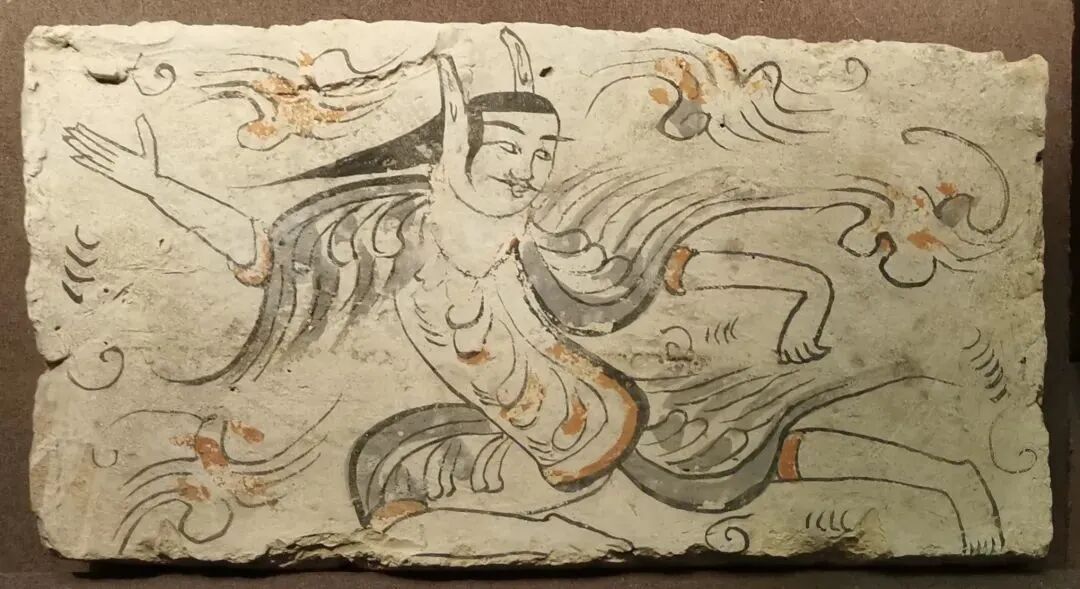 砖用白粉涂底,墨线勾勒,彩绘出羽人形象。羽人巨耳蓄髭,双肩生翼,肩部与腿部的羽毛飘逸,姿态舒展,被云气环绕。画面线条流畅清晰,色彩鲜明。羽人神色生动,其姿态与四周云气配合,具有动感。