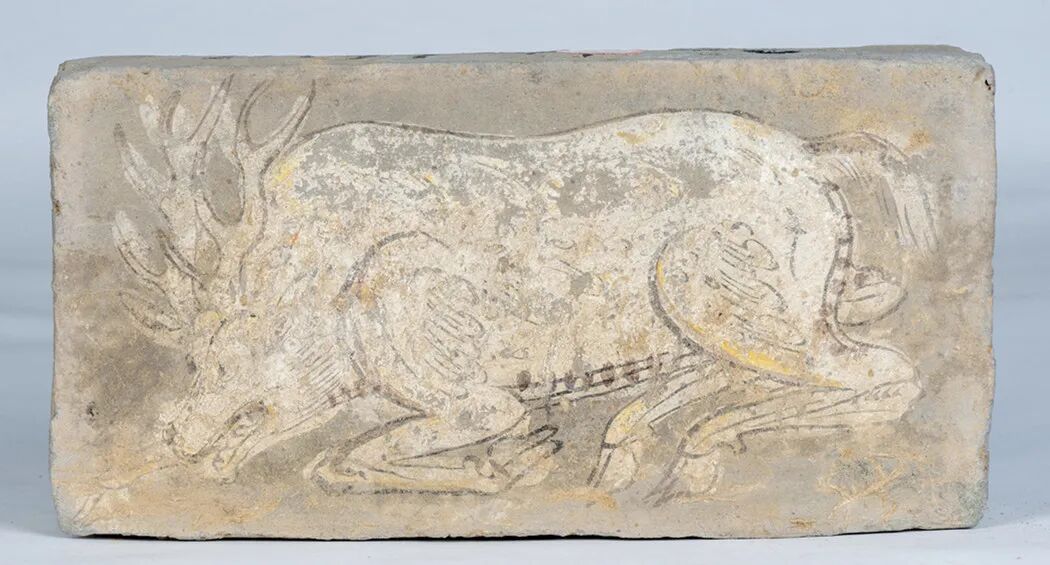 砖上神鹿图左右相对,置于照墙两侧。所绘神鹿用黑色线条勾勒出轮廓和鹿纹,鹿首似犬,暴睛长耳,张口奋蹄,形体壮硕,四肢有力,枝状大角,偶蹄短尾,前肩、后胯有排翼,身体呈蹲卧状,怒视前方,给人以严肃、威猛的感觉。
