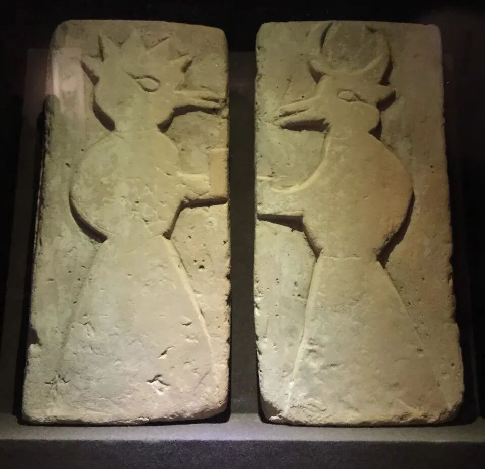 竖构图长方形砖,砖面剔地雕刻出牛首人身和鸡首人身图像,面对而立,着长袍。