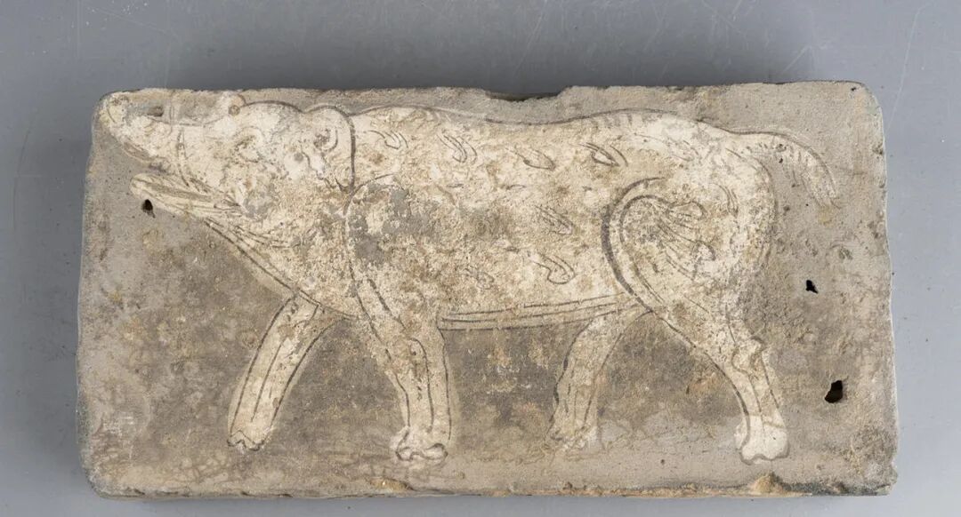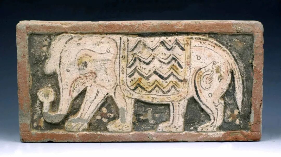 砖彩绘与雕刻相结合,减地平雕,地涂黑色,边框用土红色勾绘,既不同于画像砖,又不同于模印砖。浮雕彩绘宝象一头,垂首曲鼻,大耳剑齿,弧腹圆臀,作行走状,后胯处绘羽毛状物,象背绘鞍鞯,上彩绘四排波浪纹,象四周点缀四瓣白叶花。白象为佛教中的重要瑞兽,威力大而性情柔顺,故菩萨入母胎时,或乘六牙白象,或作白象形,表示菩萨性善柔和而有大势。另外在佛教中白象之六牙表示六度,四足表示四如意。