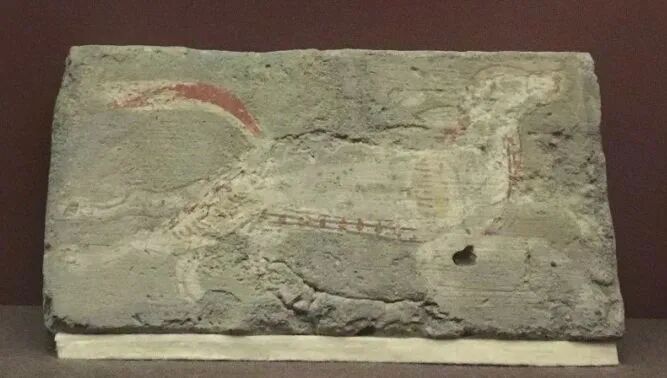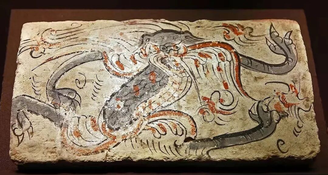 砖面用粗放的墨线勾勒出朱雀玄武合体的形象和云气,并敷彩。画面中央的朱雀背负玄武的龟甲,昂首张口,头有高冠,长尾上扬,似在跨步行走。这种朱雀与玄武合体的形象在河西魏晋彩绘画像砖中并不常见。朱雀、玄武作为天文四宫、四灵或四神兽的组成部分均有祥瑞之意。出现于汉唐墓葬在考古发掘中已屡见不鲜,而以“前朱雀后玄武”的组合形式,并用娴熟的绘画技法表现于同一画面的仅此一例。