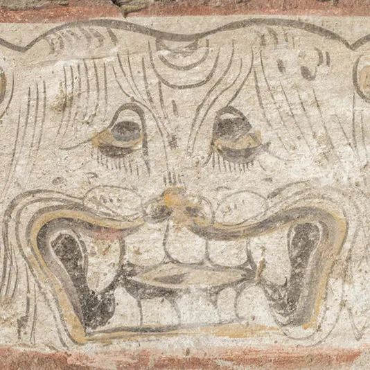 所绘图案位于砖面靠右,其额微凹,耳大而垂,眼呈丘形,下眼睑较重,云形狮鼻,巨口较扁,略呈倒梯形,上下獠牙相对,自额部起面须下垂。在中国古代墓葬文化中,兽面不仅量多且造型丰富,虽“有首无身”,但不同于商周钟鼎常见的纹饰——传说中以贪吃著称的恶兽饕餮。此画像砖中兽面应为装饰较强的虎首,取意“能食魅髓”之意。自汉代以来,古人认为虎能食鬼除凶,辟邪防疫。除虎首外,砖中兽面有的为神荼、郁垒。在墓葬文化中,该类形象多被用来当门神,有驱邪、避恶、镇煞之功效。