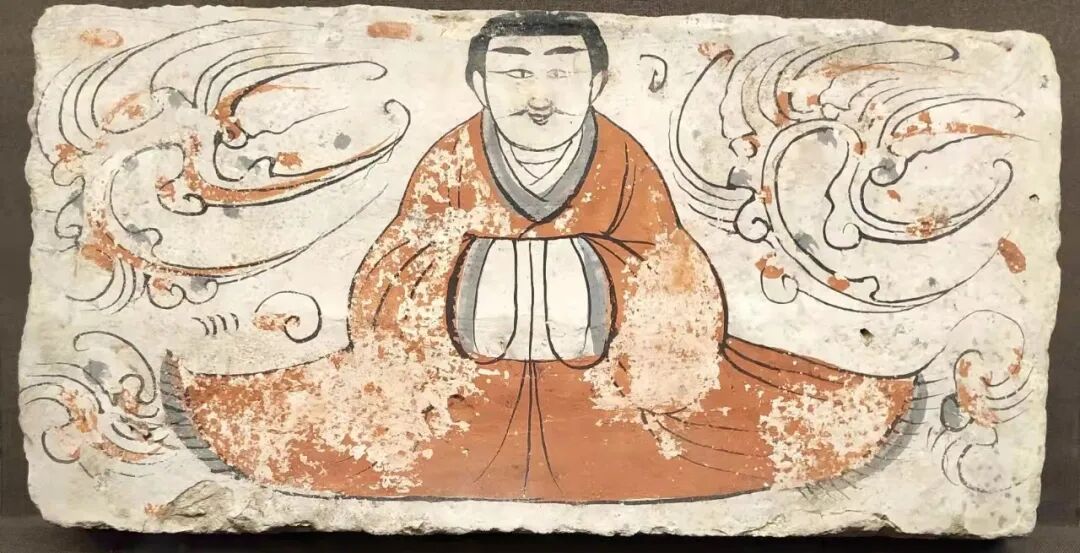 画像砖用白色涂底,红色绘框,再用红色和黑色彩绘出图像内容。砖面中央端坐一男子,头戴三山冠,肩生羽翅,前有腾空的云气,后有树状植物,应为东王公。