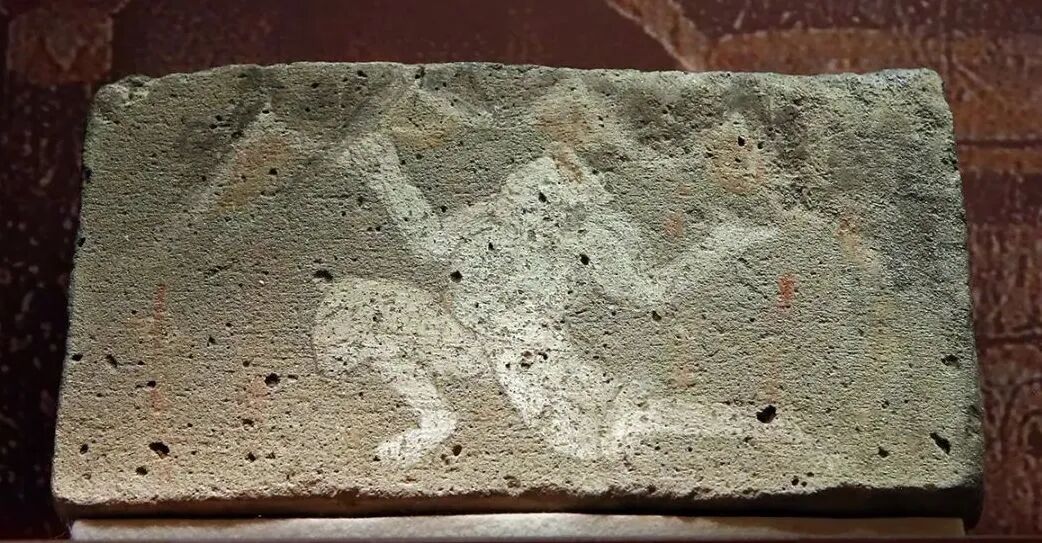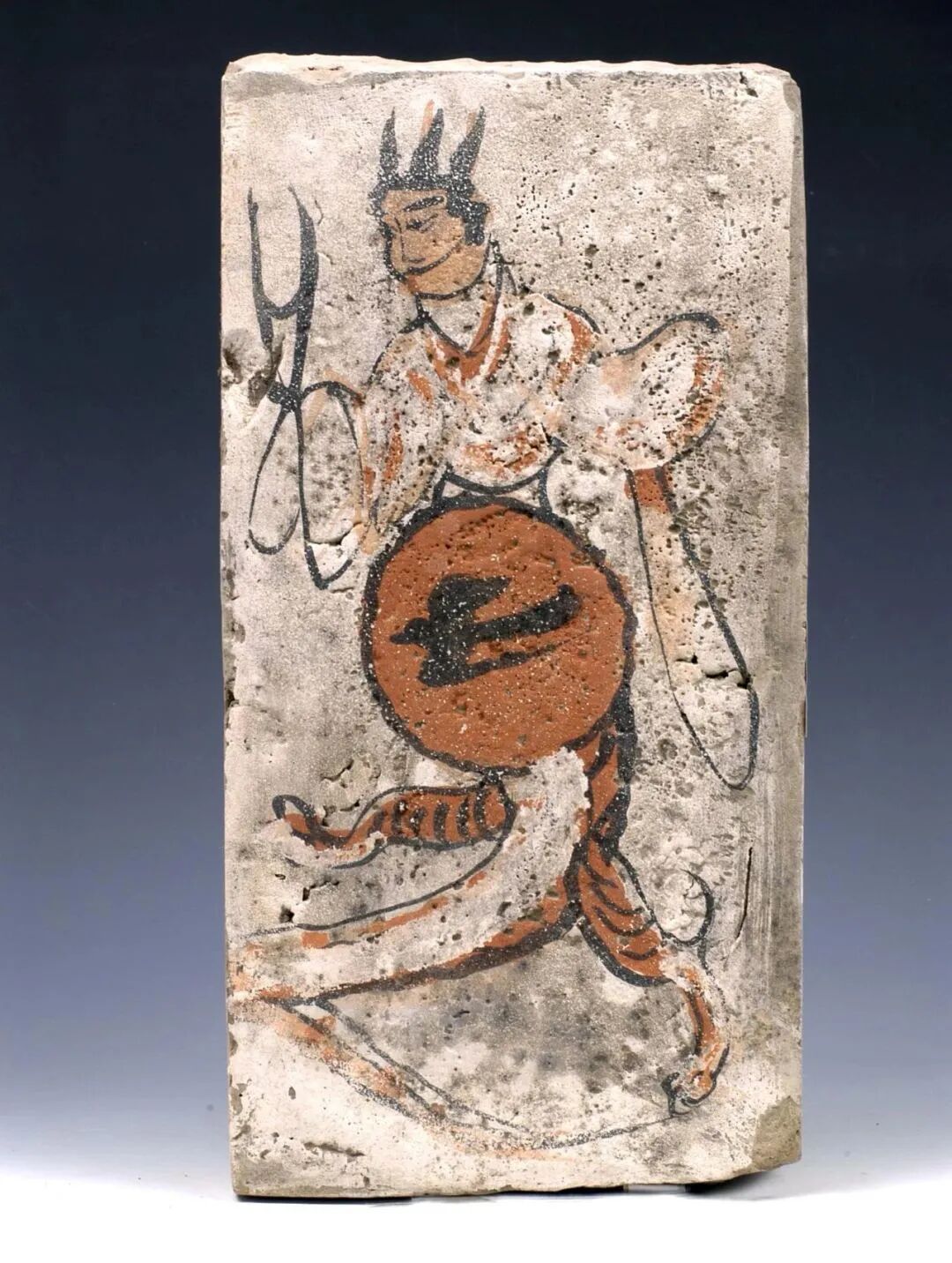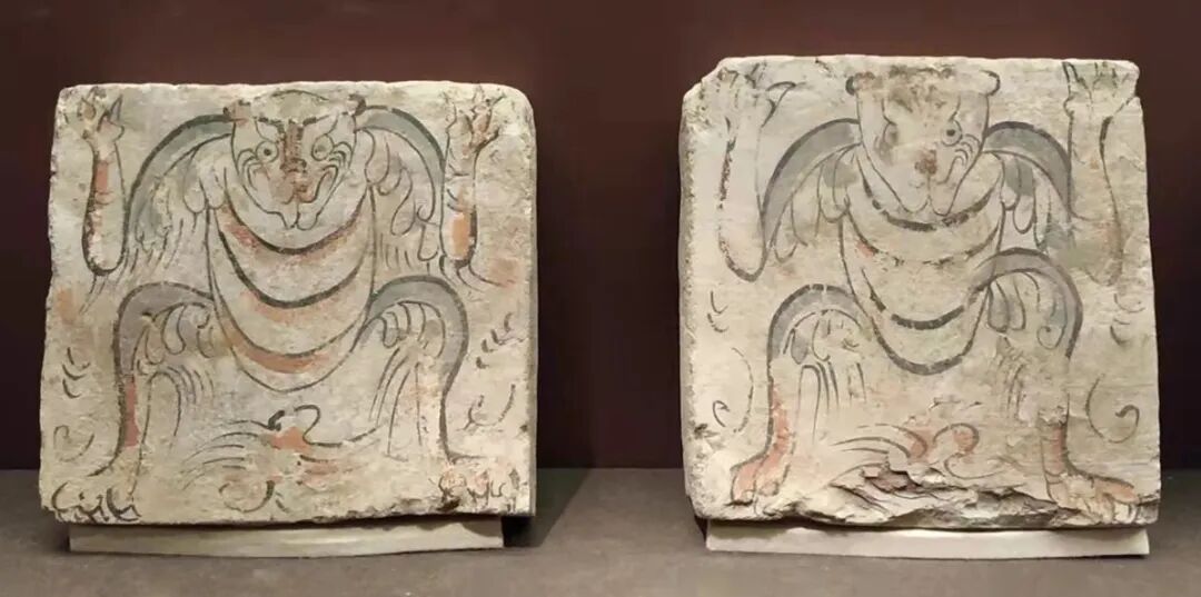 砖面绘兽首鸟爪的神怪形象,怒目圆睁,肩部、腿部皆有羽翼,张牙舞爪,似乎在怒号。有学者认为这是古时相貌丑陋、送丧开道的方相氏。