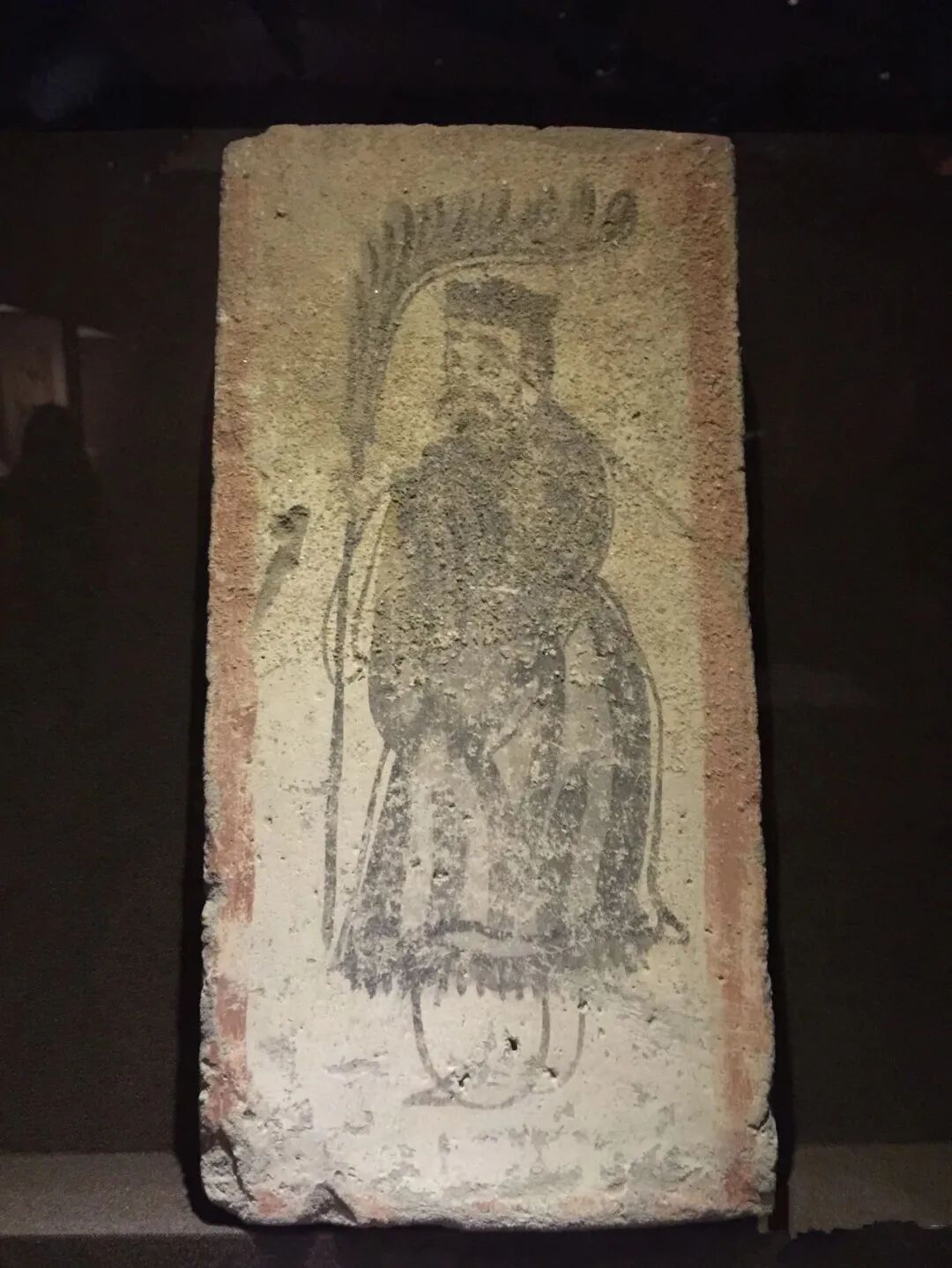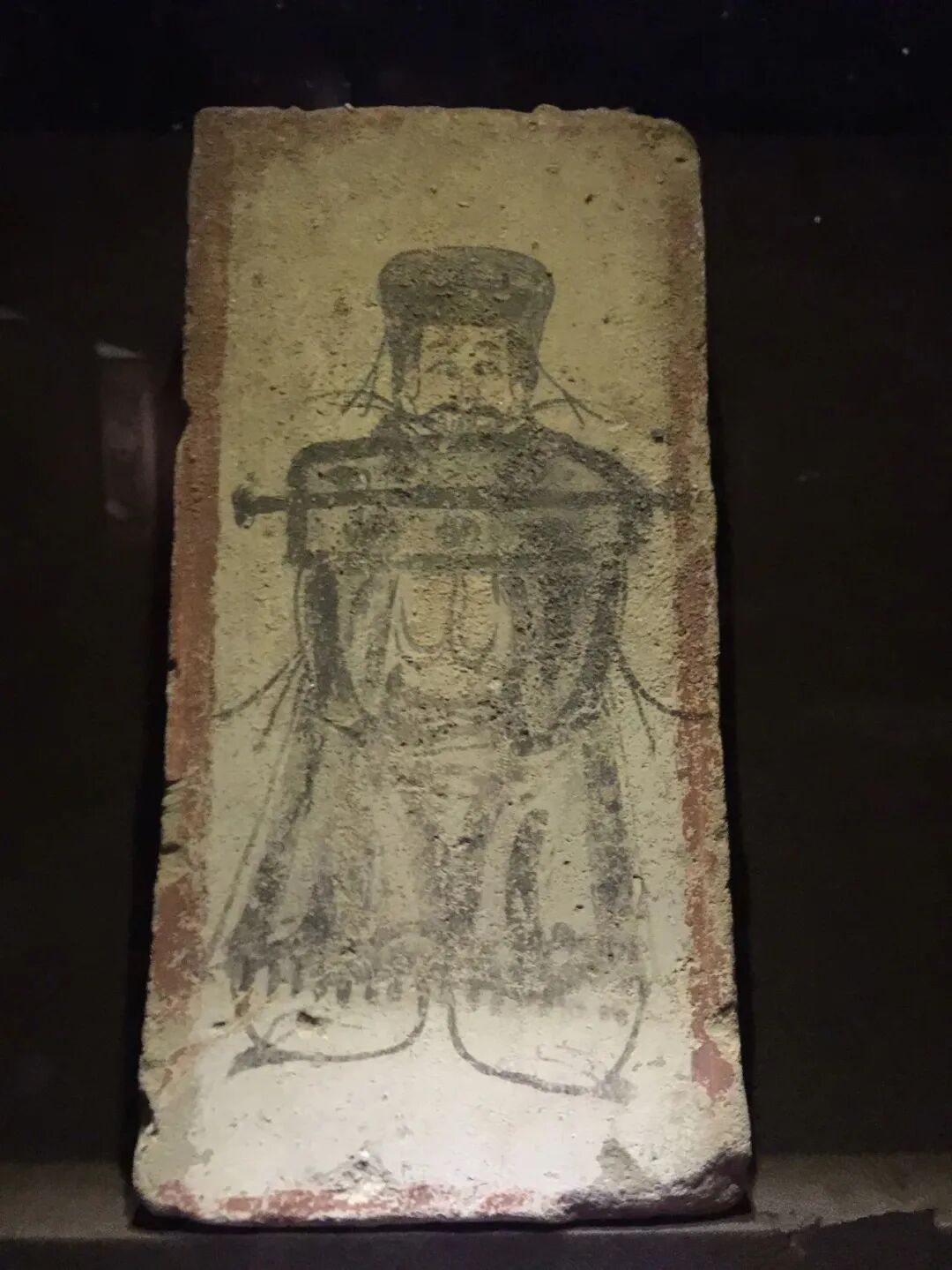 砖面以白垩涂底,上饰红色边框,中间绘一立姿男子。男子戴武冠,双手捧剑盾。两汉时期,官员和护卫在拜谒迎接时会执盾以示忠于职守和恭敬。