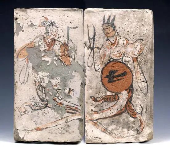 在河西魏晋画像砖中,竖构图的白虎画像砖一般用于墓室照墙的门扉上。魏晋之前,人们就相信把虎的形象画于门阑上可以抵御凶邪。在汉代画像石墓的门扉上也有白虎铺首衔环图像。这两块砖以赭色为底色,上皆彩绘黑白相间的白虎,用于镇墓辟邪。