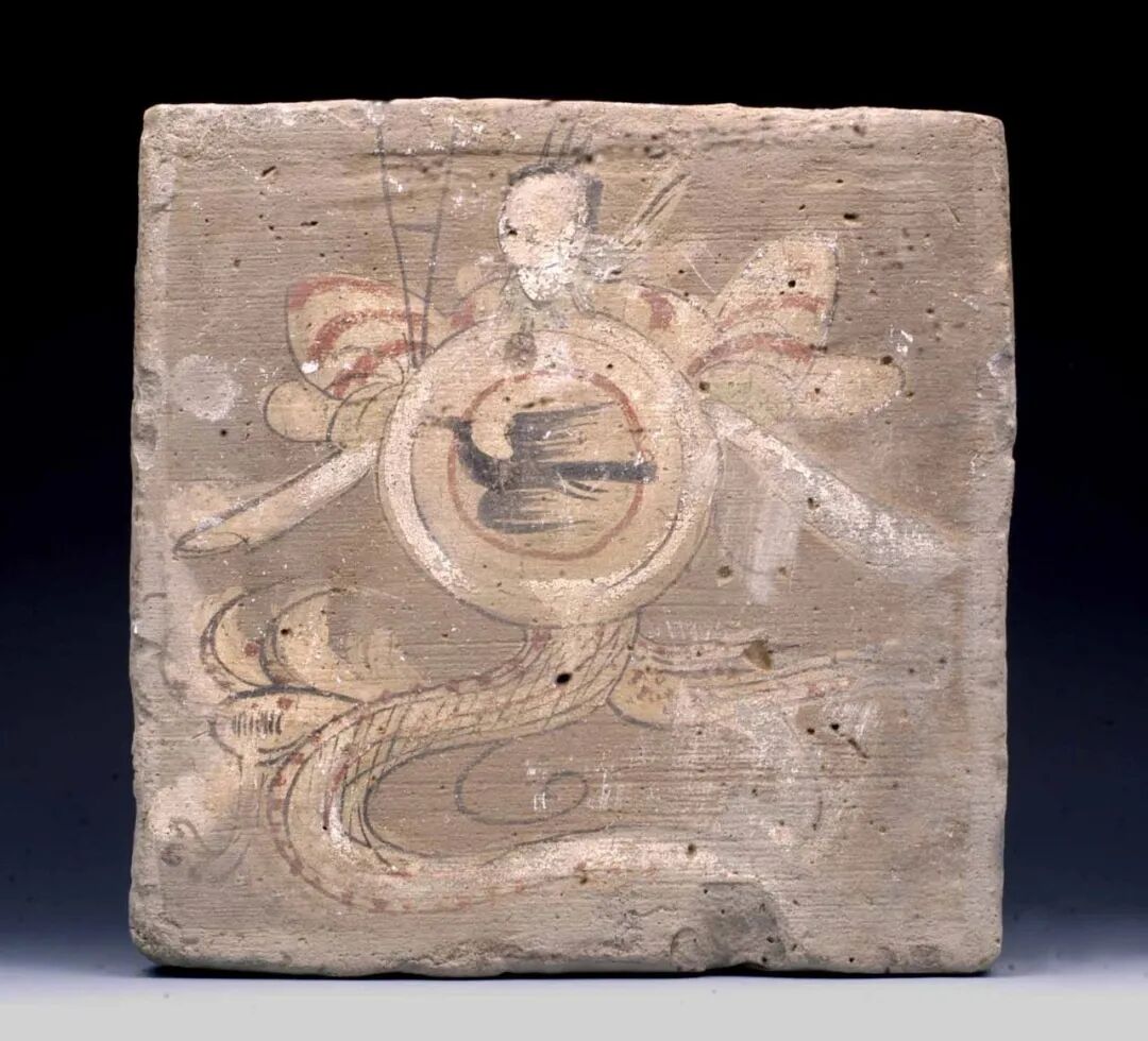 砖呈方形,四周饰白色边框,画面中央用白色涂底,彩绘一伏羲图像。伏羲人首蛇身,右手持规,头戴山形冠,胸部有日轮,中有呈飞翔状墨鸟,应为金乌。