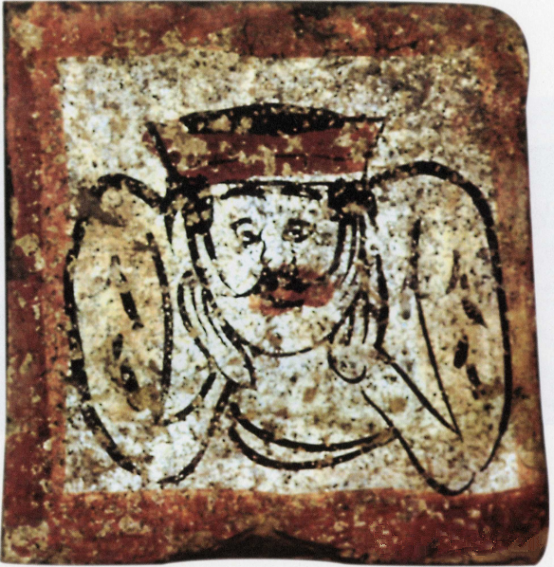 方砖彩绘头戴赤帻、浓眉圆目、双手托腮的力士形象。