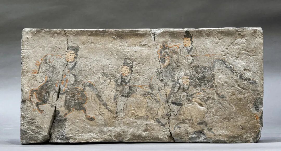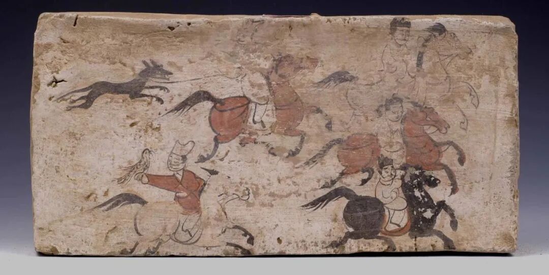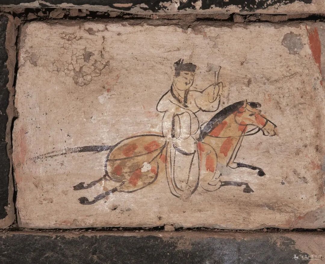 砖用白色涂底,绘有五人骑马出行的场景。右侧绘三骑并驰,三人头戴黑介帻分别骑红、黑、白马,随后的两骑,一人牵猎犬,一人架鹰。砖原位于前室南壁第三层,是出行图中的一个画面。该墓前室由7块砖的单独画面构成一长卷式出行图,每幅画面绘2至5人不等,前后连贯形成庞大的出行队伍,横贯三个壁面,体现了墓主人出行威仪。