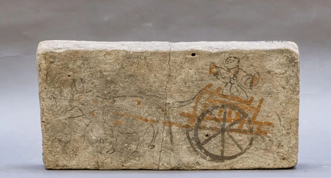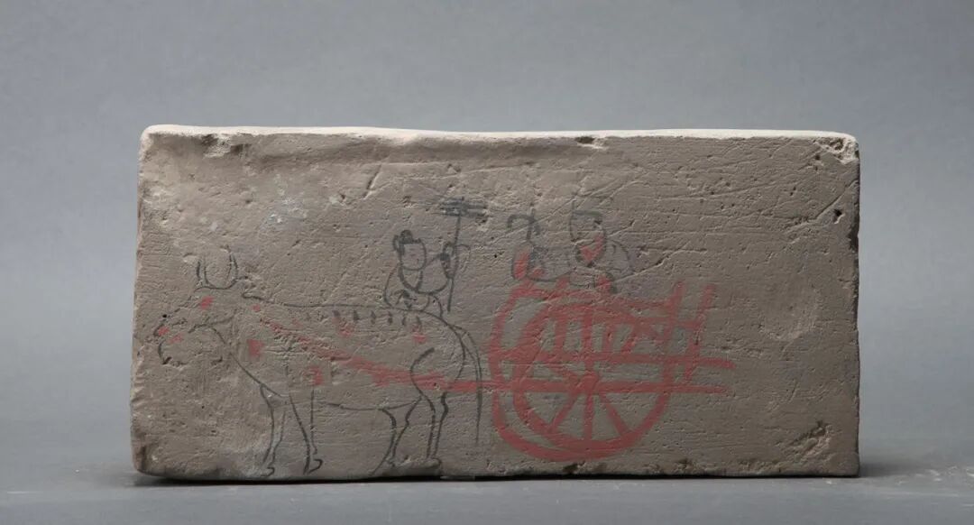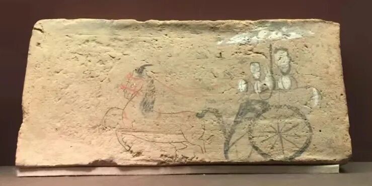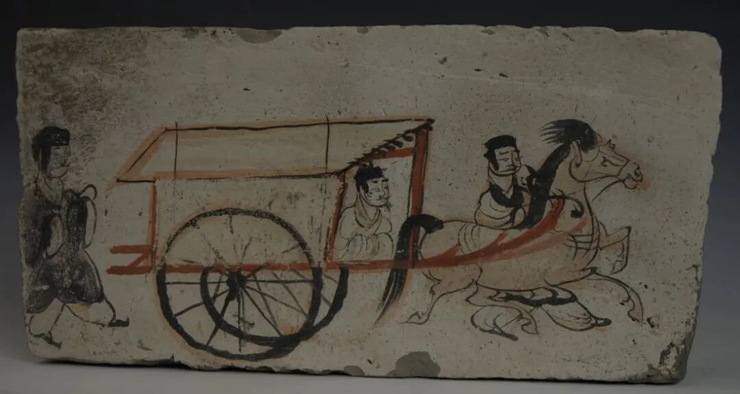 砖上绘一男子驾车出行的场景。砖原位于墓前室北壁中层。