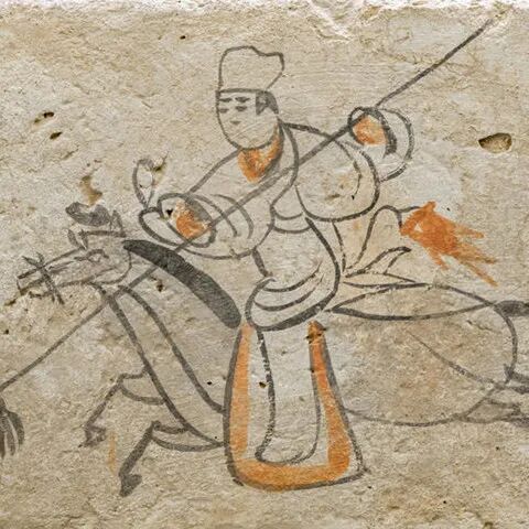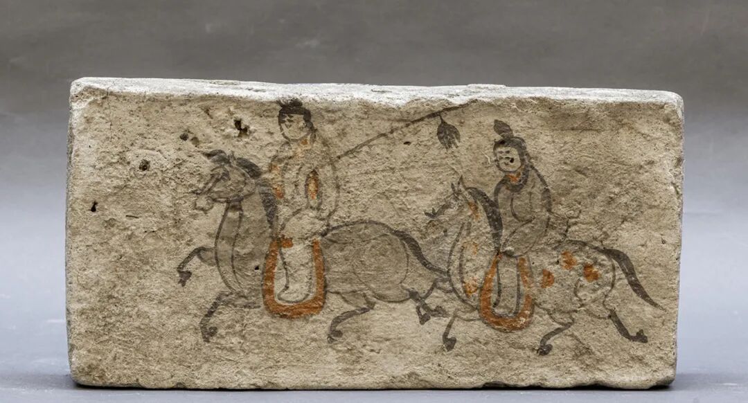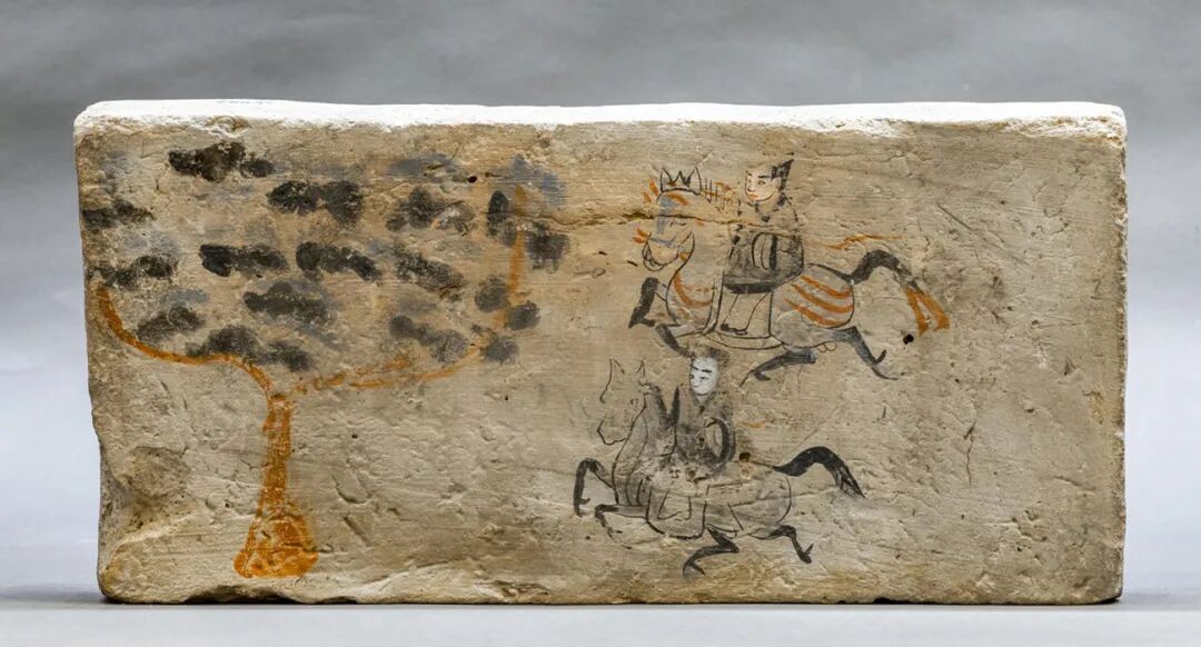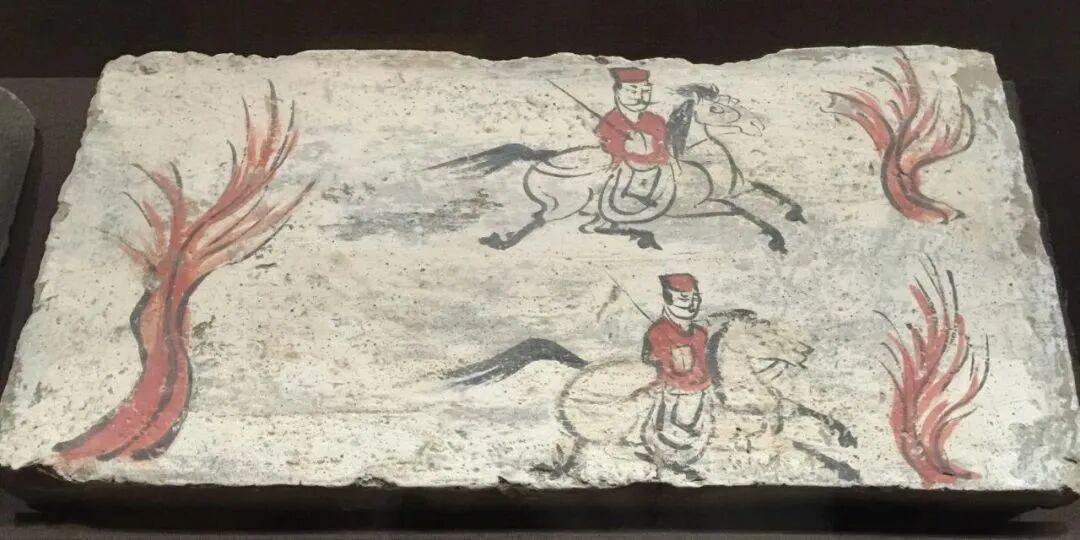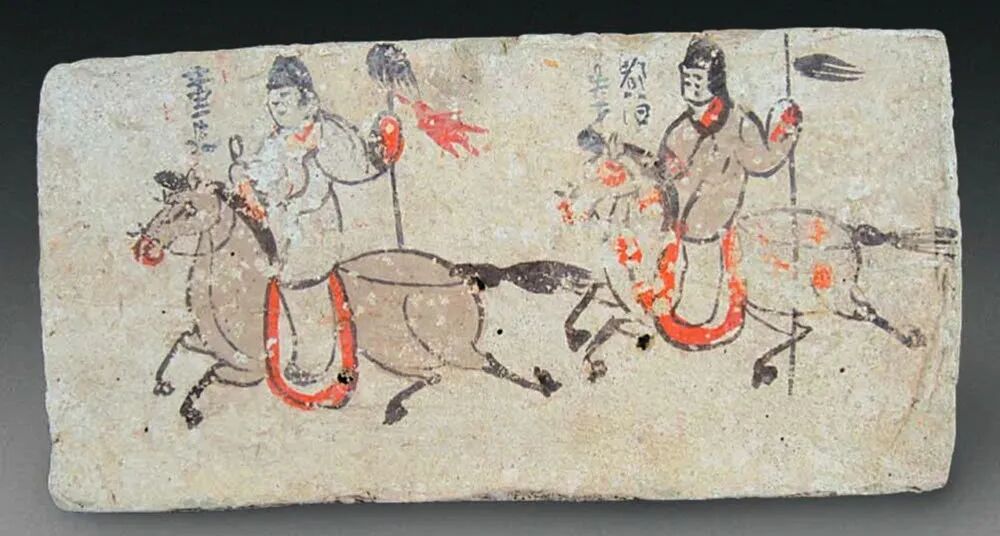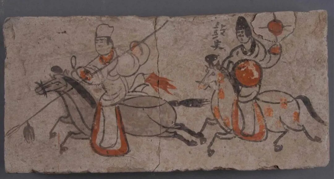 画像砖前方的士卒头戴白帻,上身穿红缘交领衫,下着裤,骑于马上,双手执长矛刺向前方。后一身骑卒,头戴兜鍪,上着黑缘交领衫,下着裤,骑于白马上,身前置一鼓,左手高举鼗鼓,紧随其后,身旁榜题“鼓史”。画中马蹄腾空,颇具动感。墨线勾勒轮廓,红色点染,画面色彩清新明快。“鼓史”为击鼓鸣金的官吏。关于鼗鼓,《周礼·小师》记载:“鼗如鼓而小,持其柄摇之,旁耳还自击。”即俗称的拨浪鼓,一般木柄上贯以一到三个小鼓,两侧系垂耳,摇动击鼓面发声。最早见于汉画像石中。所绘鼓史可能是车马出行时的仪仗成员。
