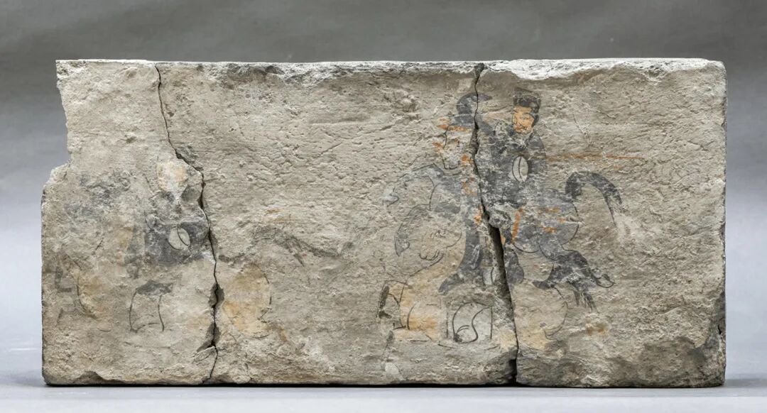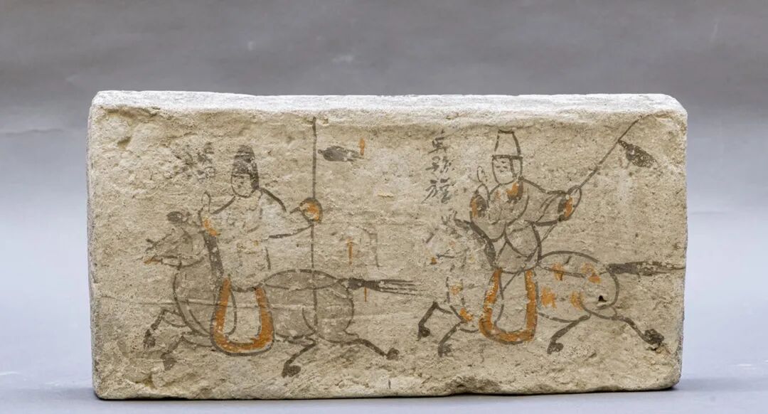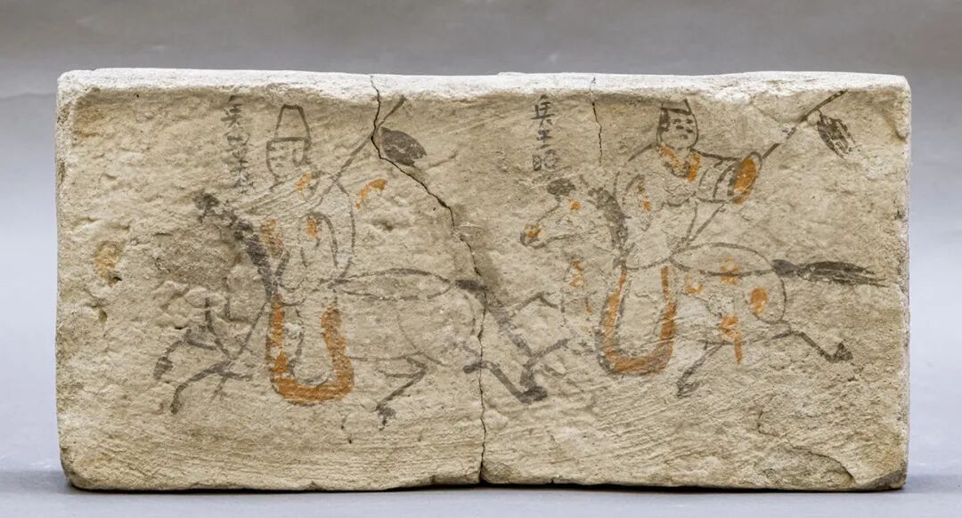 该砖绘身着交领的两名男子各骑一马执矛出巡,后者回望身后。二人身边分别墨题“兵鲁义”、“兵王昭”,这里的“兵”或许是鲁义等人的户籍身份。