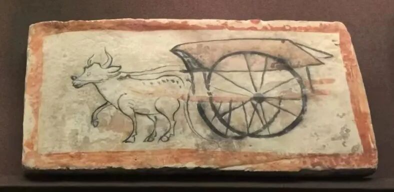 牛车作为中国古代的一种主要交通工具,从考古发掘中得出,早在三千多年前的商代就已被发明。三国时期蜀国谯周《古史考》中记载:“黄帝作车,引重致远。其后少昊驾牛,禹时奚仲驾马。”其中少昊乃黄帝之子,说明早在黄帝时期就有御牛驾车的记载。春秋时期,“老子骑青牛出函谷关”“孔子坐牛车周游列国”的故事,早已人尽皆知。早期牛车只是被寻常百姓用来拉运货物,东汉末年以后,一些制造与装置较为讲究的高级牛车开始出现,多为当时的豪门贵族所乘坐。《晋书·舆服志》记载:“古之贵者不乘牛车,汉武帝推恩之末,诸侯寡弱,贫者至乘牛车,其后稍见贵之。自灵、献以来,天子至士遂以为常乘,……御衣车、御书车、御轺车、御药车,皆驾牛。”古时路况不好,均为土路,难免坑坑洼洼,而牛车行走速度较为缓慢平稳,颠簸的程度较马车要小,扬起的尘土也少得多。且牛车车厢较大,既有车篷,又有围挡,人在里面可以自由坐卧。于是,魏晋南北朝时期牛车广泛流行,逐渐成为官员、贵族乃至皇帝的主要代步工具。