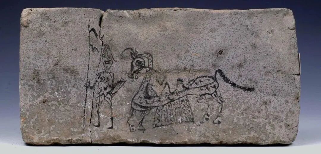 墨线绘制,画面表现出征场面。画中人物全副武装,头戴帽,脚穿长靴,一手紧握缰绳,一手持旌旗,身后高头战马一匹,身瘦长,前蹄短小,马尾长扬,马身饰鞍。画面表现了准备出征的情景,技法稚拙简约。该墓葬前室南璧西侧上部一砖上墨书“建元十四年十二月十三日安错……”题记。经考证,该画像砖年代为前秦建元十四年。