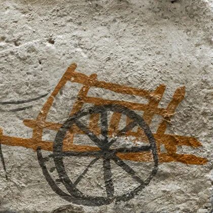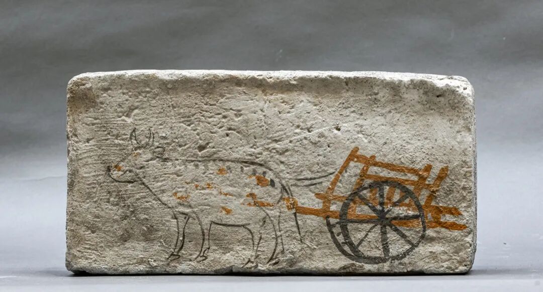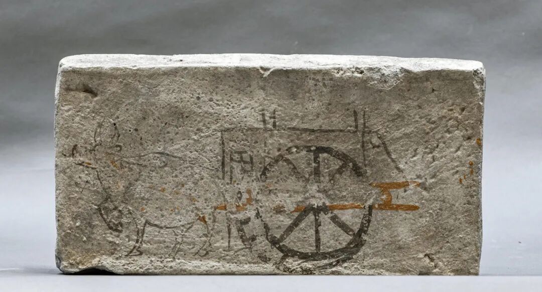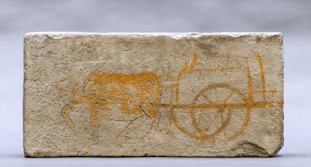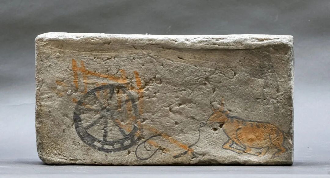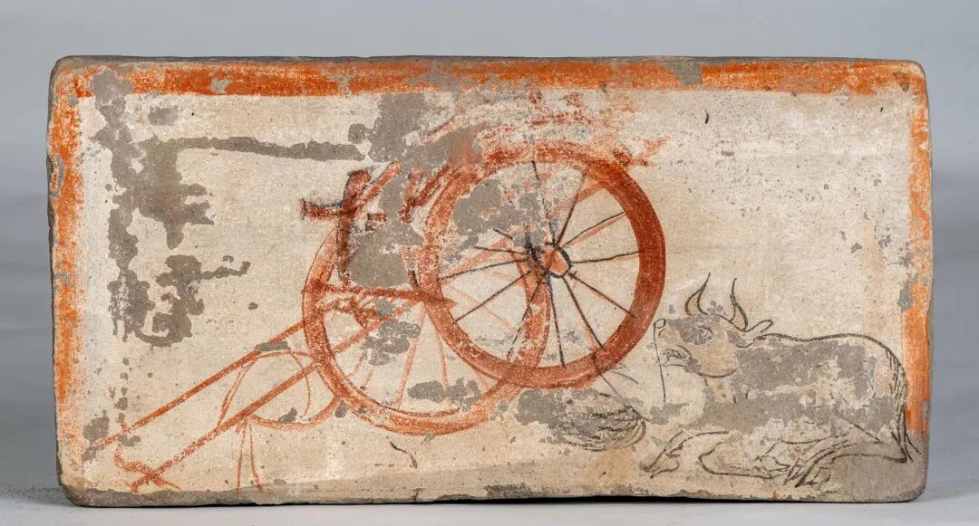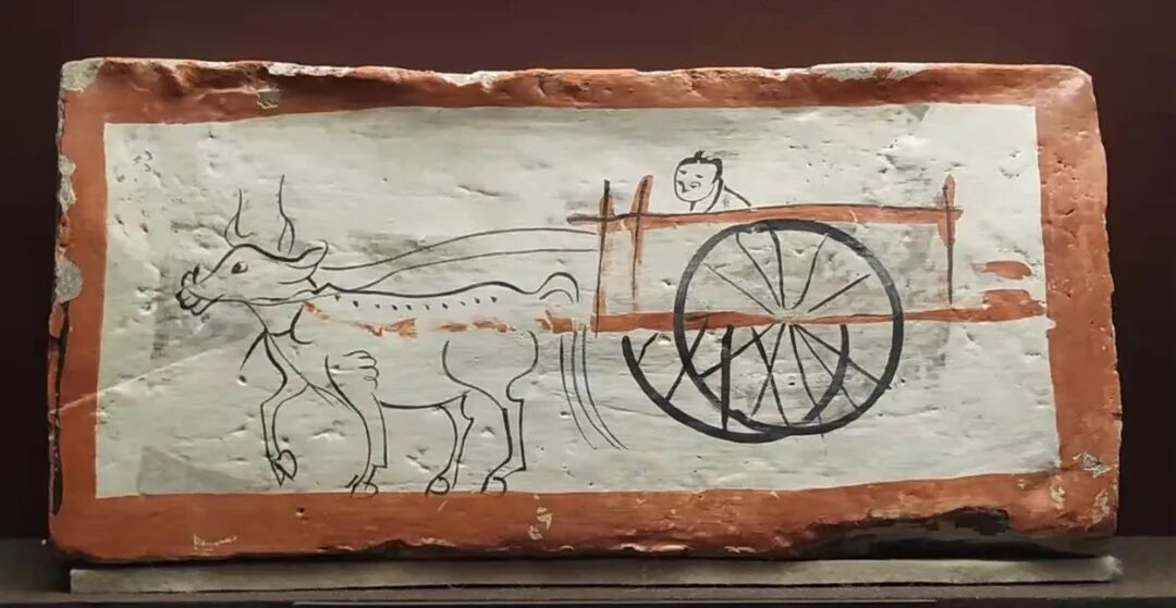 该砖绘犊车前行的画面。犊车车轮阔大,两辕直出车后,车顶有卷棚。同形制的车又见于同墓前室西壁。有学者认为这种外形像树干一样的辕的使用,表明这种大车仍然沿用汉代辇车的形制。