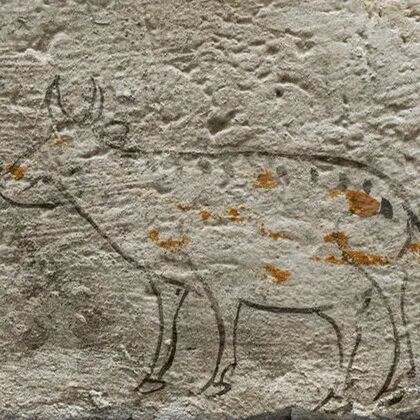 画面右侧为一卸套歇息的卧牛,其双耳耸立,双目圆睁,长尾自然下垂,牛身浑圆结实、粗壮有力,缰绳与其头前的料篓相连。画面左侧为一大轱辘车,长辕搭地,辕头横轭。据史料记载,这类车名谓“露车”。《后汉书·灵帝纪》中平六年条记:“(灵)帝与陈留王协夜步逐荧光行数里,得民家露车,共乘之。”《资治通鉴》卷五九灵帝中平六年条注云:“露车者,上无巾盖,四旁无帷裳,盖民家以载物者耳。”“露车”即为无帷盖的大车。