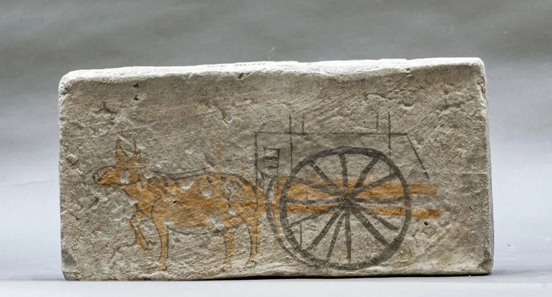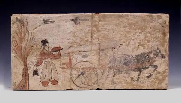 砖上绘一男子驾牛车前行,后有一婢女一手托盘一手提扁壶随车前行。砖原位于墓前室西壁中层。