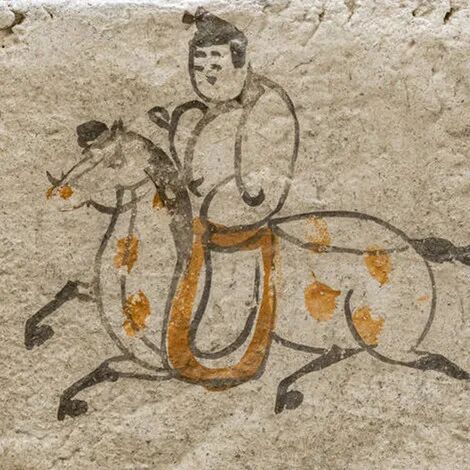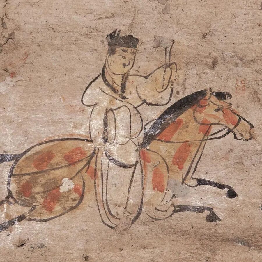 画中两士卒均头戴兜鍪,上着红缘交领衫,下着裤,右手紧握缰绳,左手持长幡,幡头为黑色牛尾。前者榜题“童史”,后者榜题“都伯吴才”。图中骏马做奔腾状。人物衣服、骏马一白一灰,协调对称,红彩点染,使画面生动而具活力。“童史”即“幢史”,为负责持旌幡幢旄一类仗仪的官吏。画中榜题为我们了解魏晋时期“童史”及其职责等提供了实物资料。