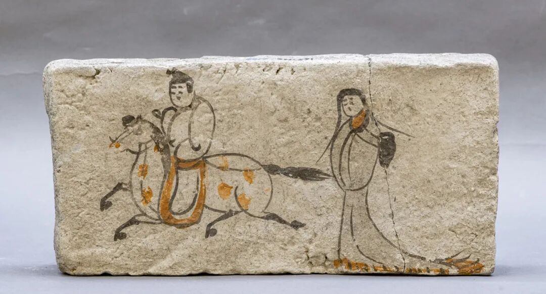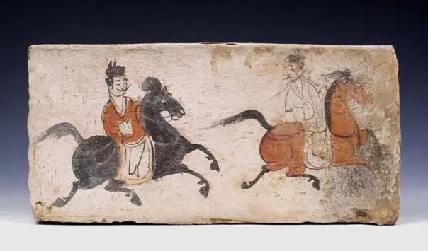 该砖绘一男子骑白花色骏马疾行,一女子面露愁容,作依依惜别状。女子长发披肩,长裙袭地,身背挎壶站立送行,有学者认为这是羌族女性的形象,是河西地区民族融合、通婚的体现。