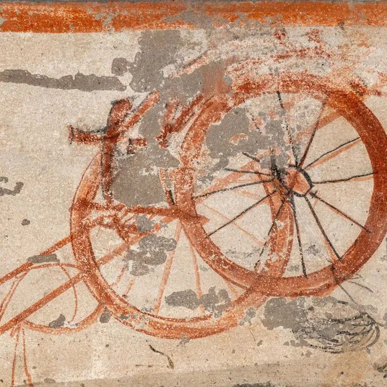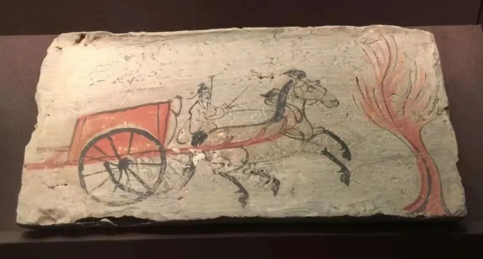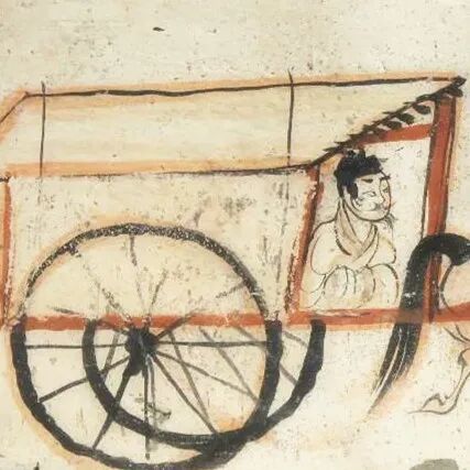 马驾篷车在奋蹄飞驰前进,车上端坐一人,驭者随于马之左侧,车后随一侍从。河西地区风沙较大,因此使用篷车代替了中原较为流行的伞形华盖。这里的马驾篷车,对于判断墓主人身份有重要意义。此图用笔泼辣,线条洗练,极其生动传神,是画作中的杰作。