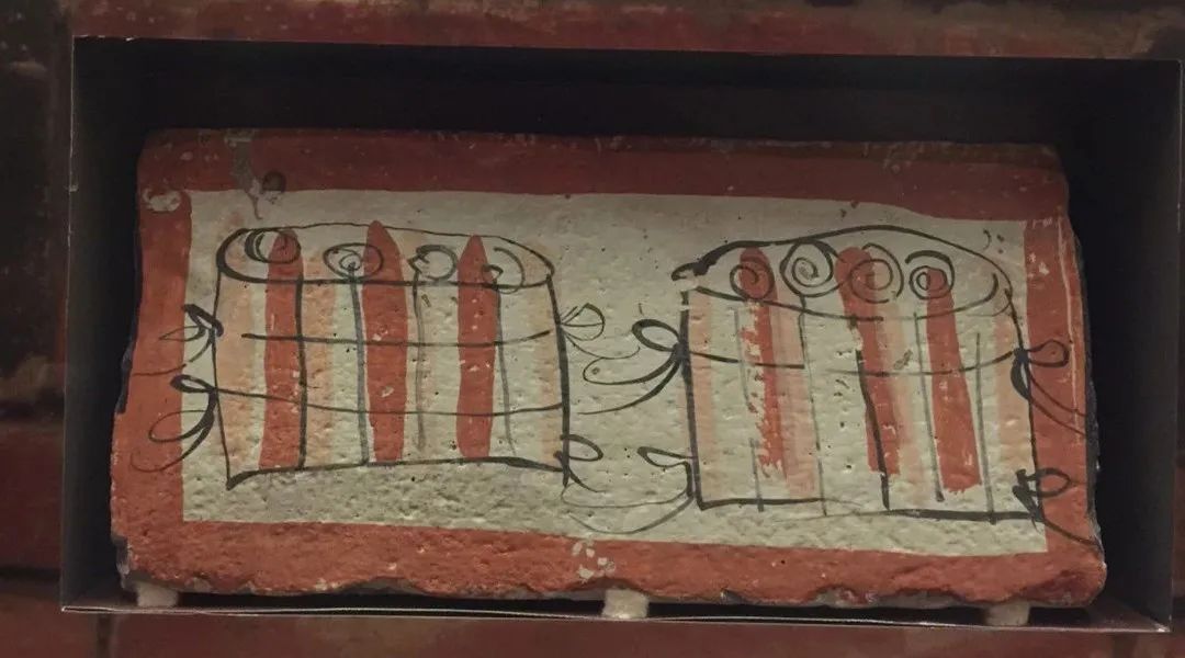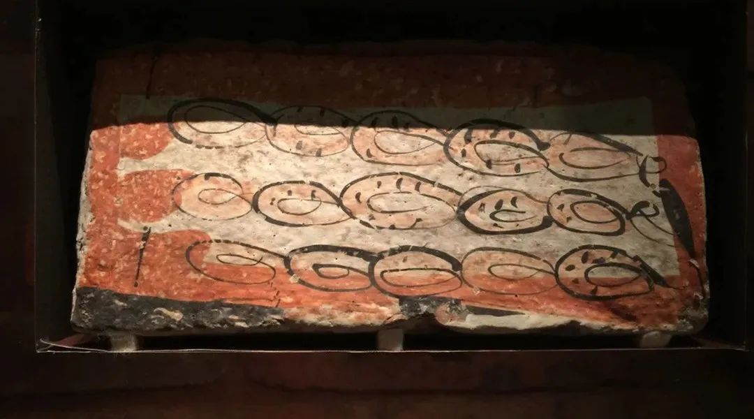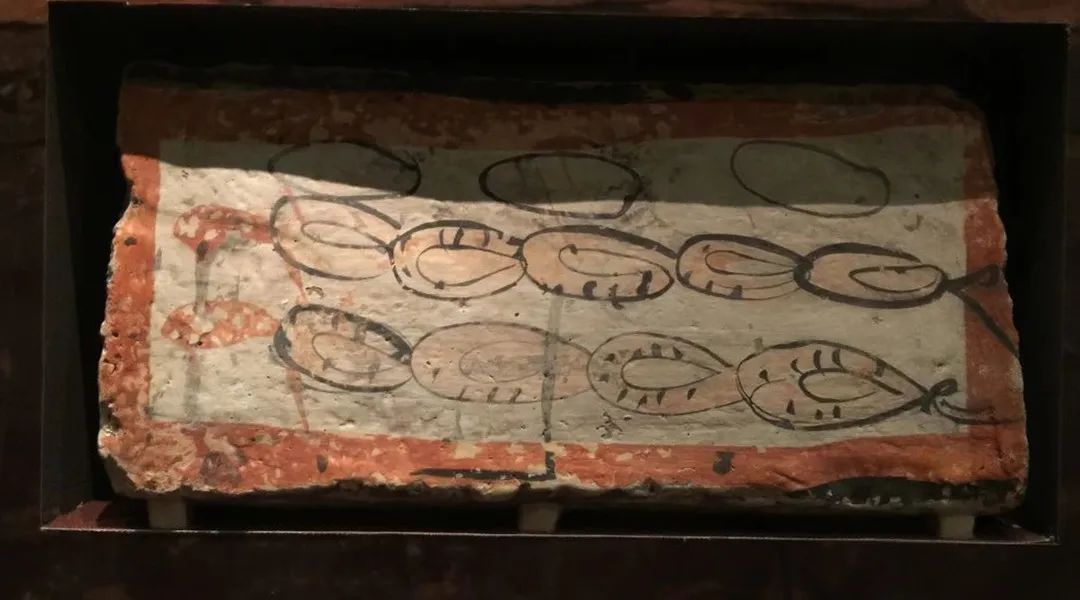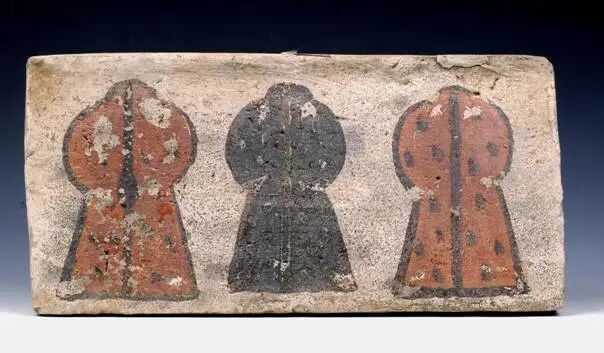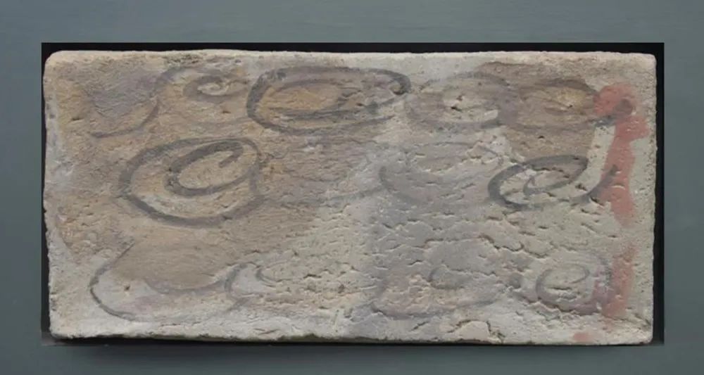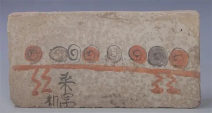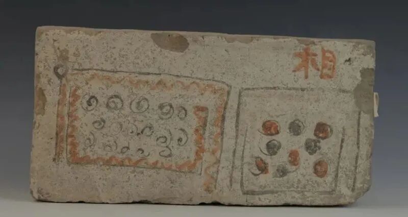 砖先以白粉涂底,后以红黑二彩画出图案,画面用墨线画两方形,内画圆圈状图案,部分施红。画面右上角有朱书题记“相”字,经释义,此字当为通假字,应通“箱”字,意在箱内盛放着卷卷布帛。自东汉末期后经济凋敝,民间随之出现以丝帛来代替货币在市场以物易物,故墓葬中绘制丝帛图像意为财富之象征。