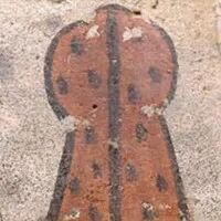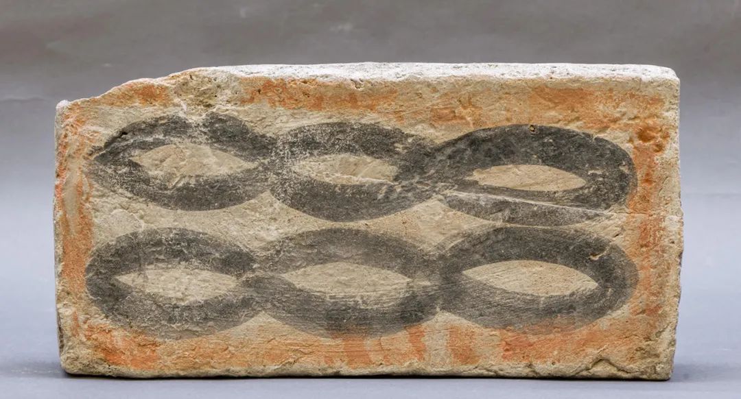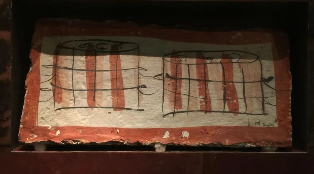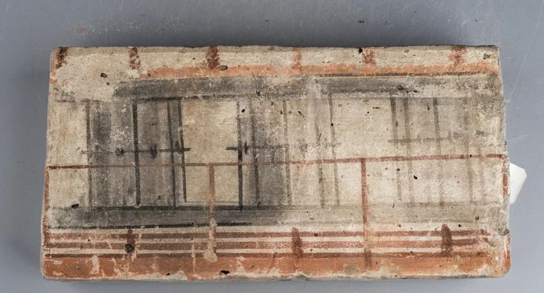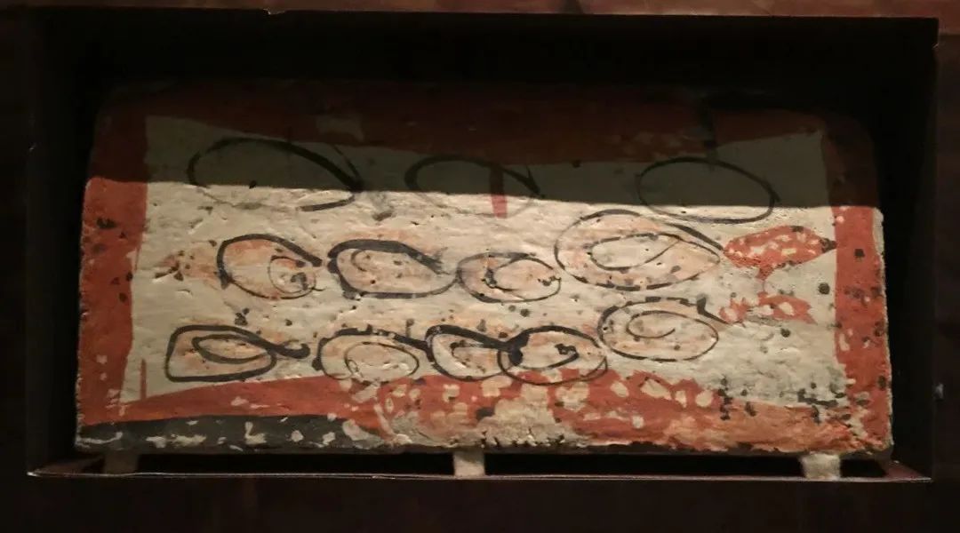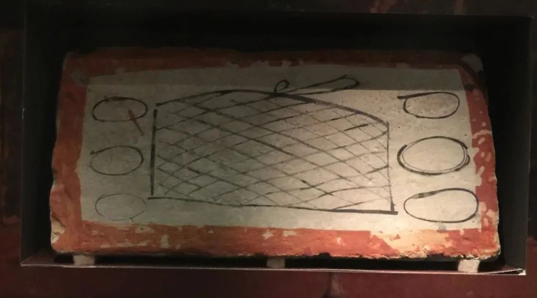 砖先以白粉涂底,后以红黑二彩画出图案,画面用墨线画两方形,内画圆圈状图案,部分施红。画面右上角有朱书题记“相”字,经释义,此字当为通假字,应通“箱”字,意在箱内盛放着卷卷布帛。自东汉末期后经济凋敝,民间随之出现以丝帛来代替货币在市场以物易物,故墓葬中绘制丝帛图像意为财富之象征。