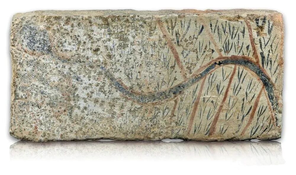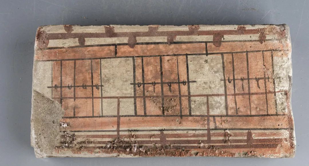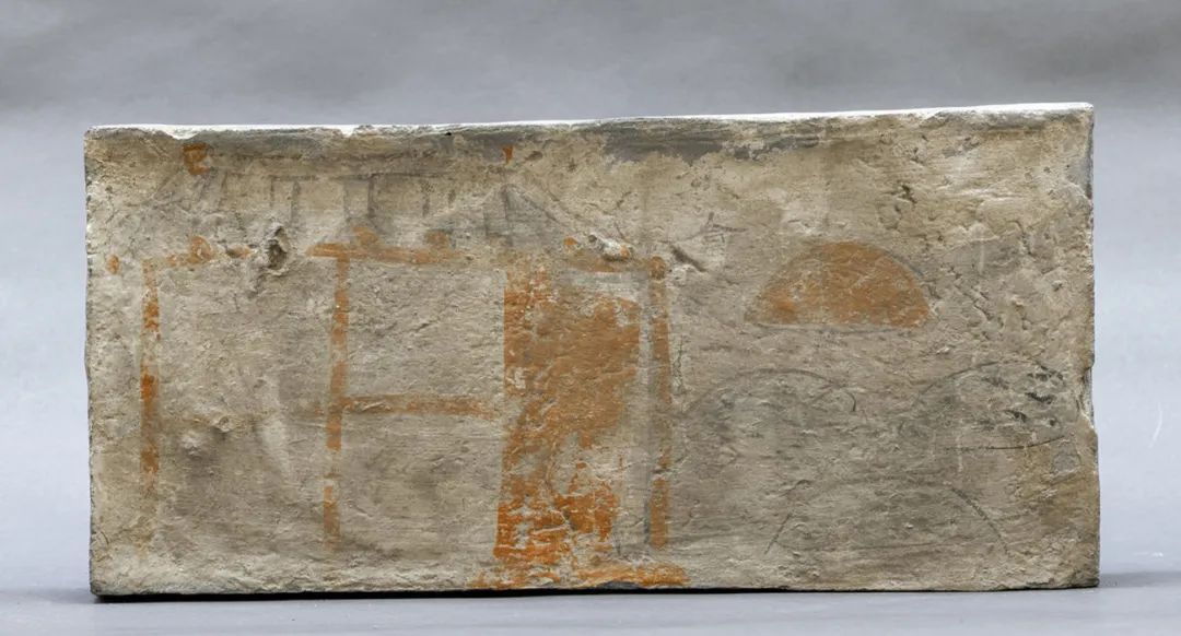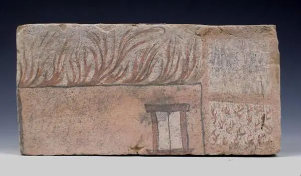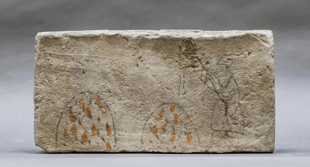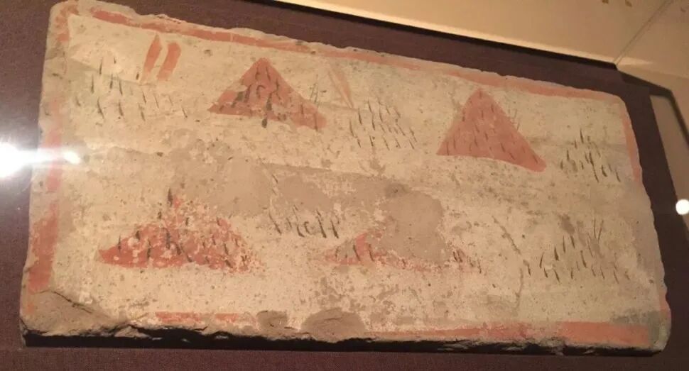 该砖四周绘红色边框,画面中有几堆涂红或涂黑的三角形粮堆。该堆粮场景或是为了晾晒粮食,晒热后进仓储存可以避免虫害,同时不影响发芽,利于长期存储。