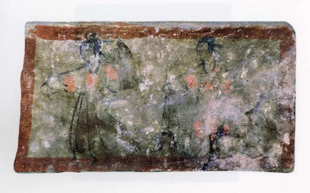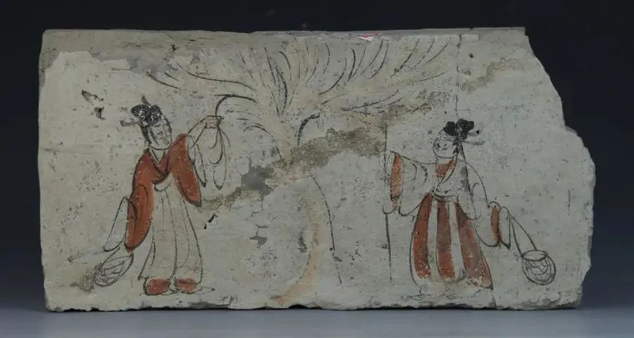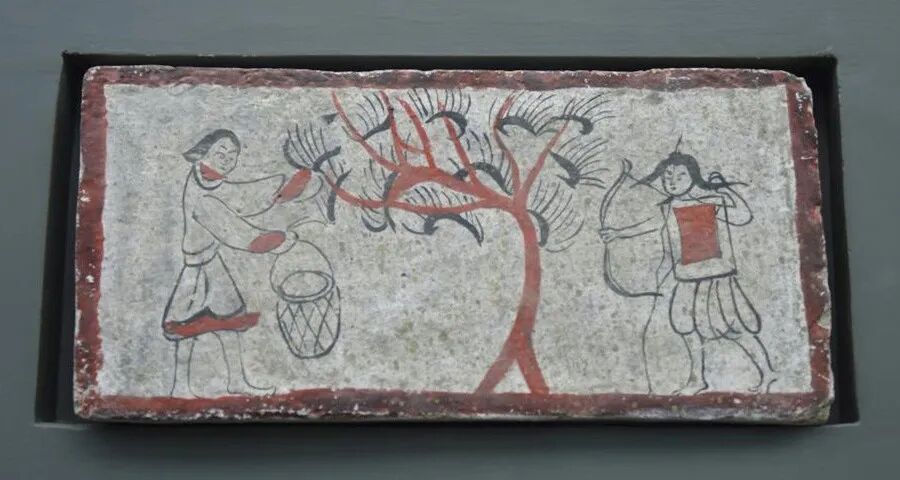 砖右角缺损,砖面以白粉饰底,以红黑彩绘画。画面中央绘一高大桑树,树下左右各站一女正在采桑。左侧女子身着红衣,浅色长裙,红色鞋子,黑发梳髻,一手提桑笼一手采桑。右侧女子身着红领白衣,红白相间的长裙,黑发梳髻,一手提桑笼一手持桑钩采桑。图像寄托了墓主人希望多子多孙、生活美满的愿望,反映了河西地区魏晋时期种植桑树和养蚕的情况。该画面也说明至迟在十六国时期,在古丝绸之路上的甘肃河西地区已经能够种植桑树、养殖桑蚕,并可以生产丝绸产品。