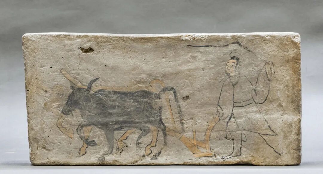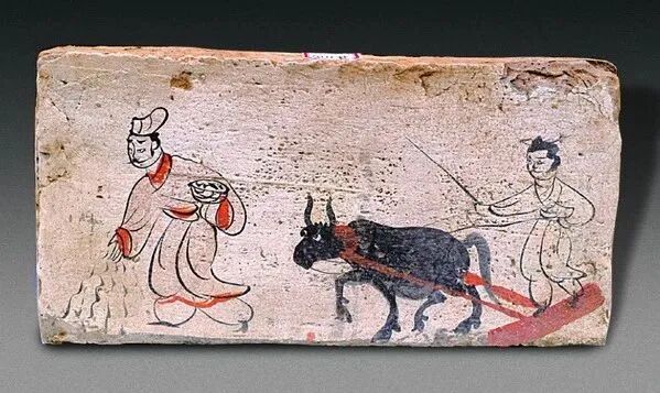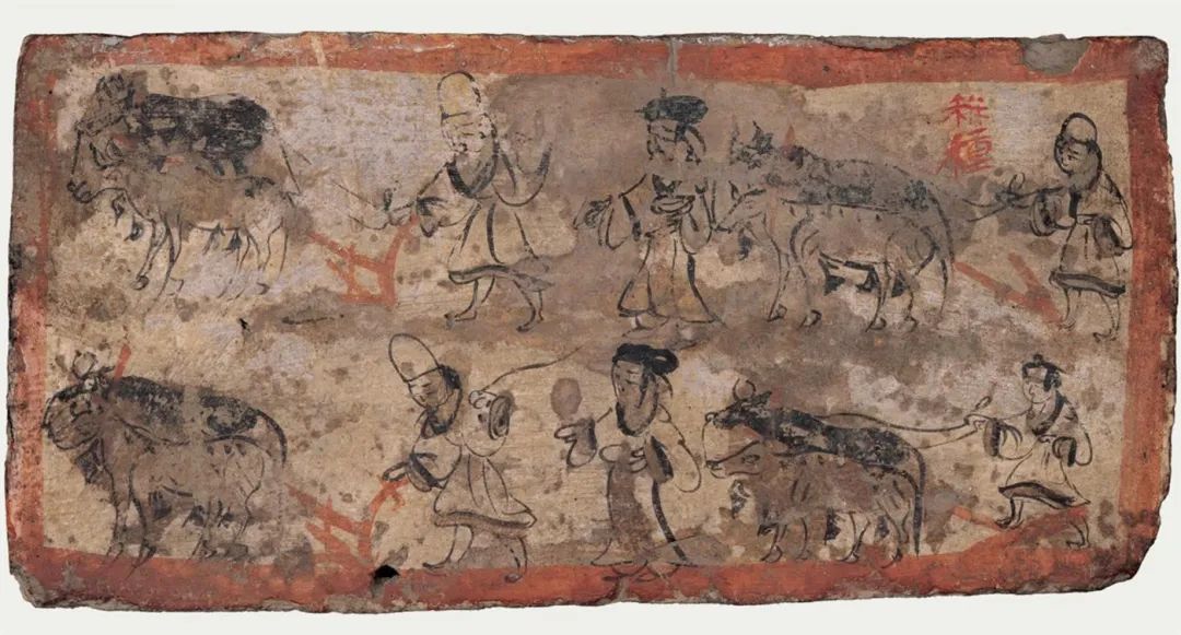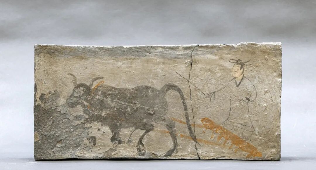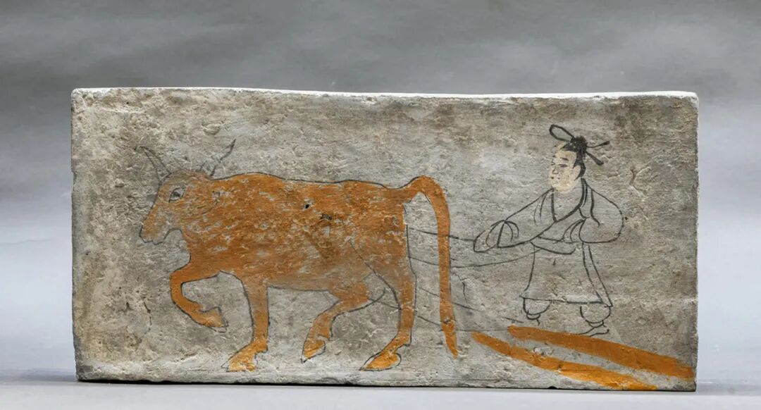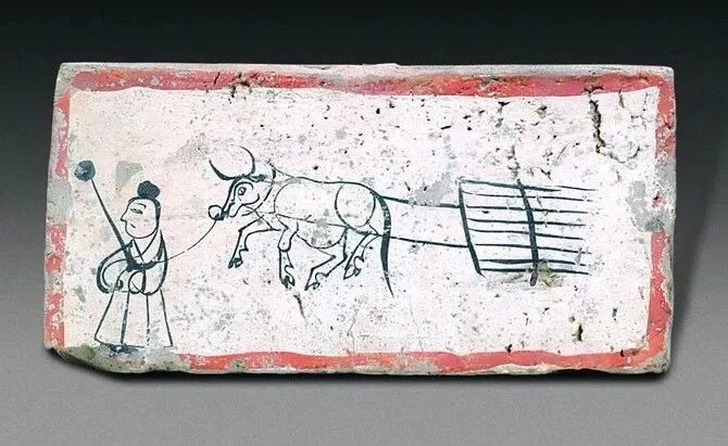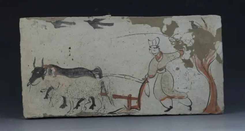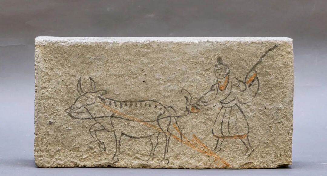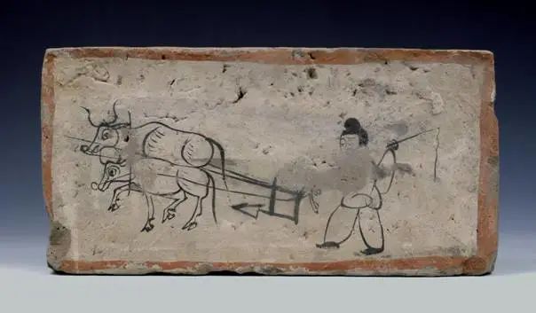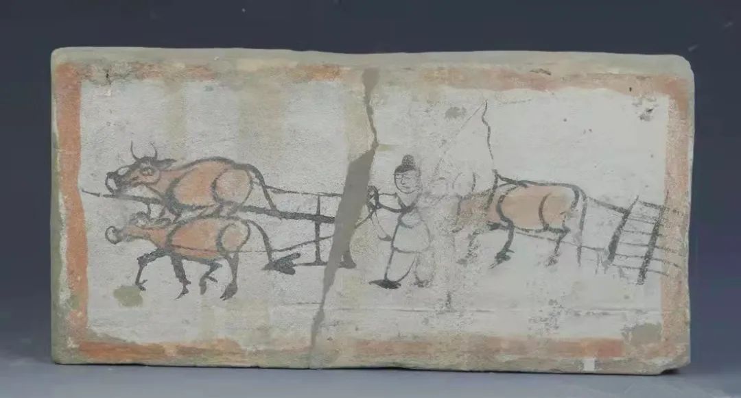 砖上绘一牛正在拉耙,牛前站立一人,深目高鼻,头发棰结,衣袍左祍,双手合抱,手中握有缰绳,怀中抱着一木棍状物。