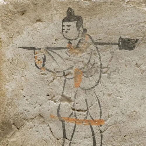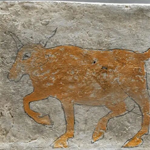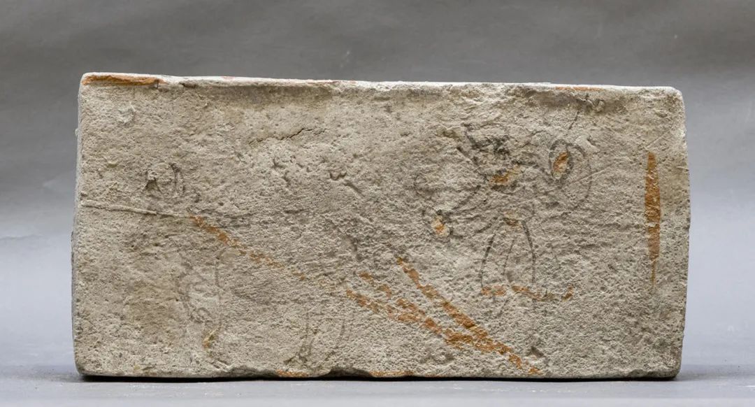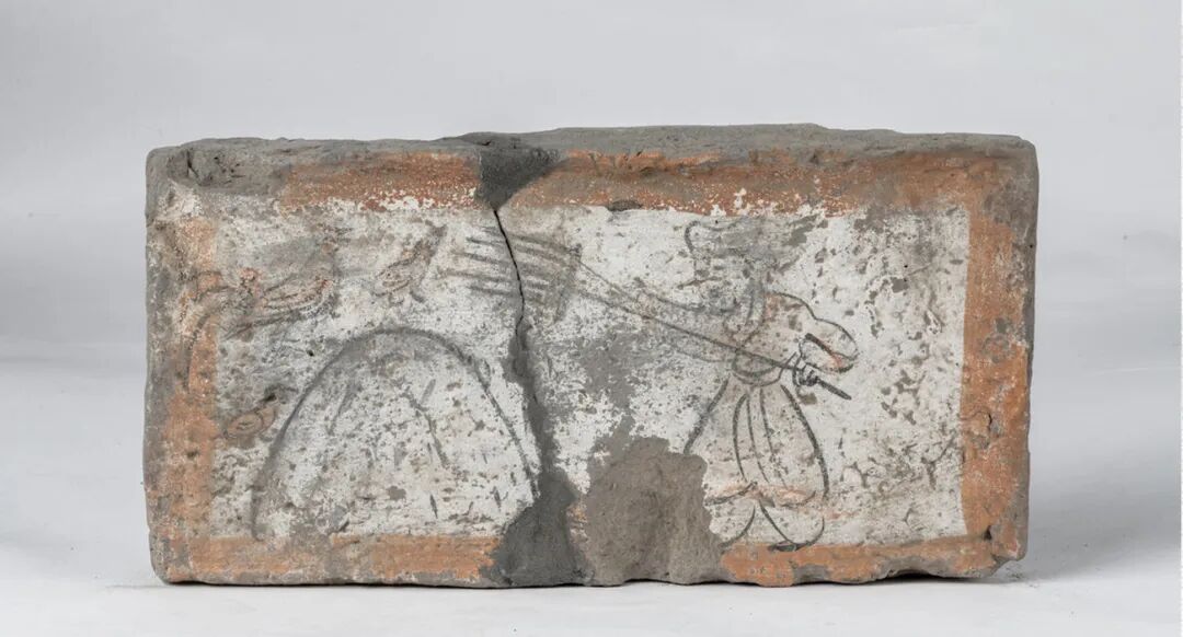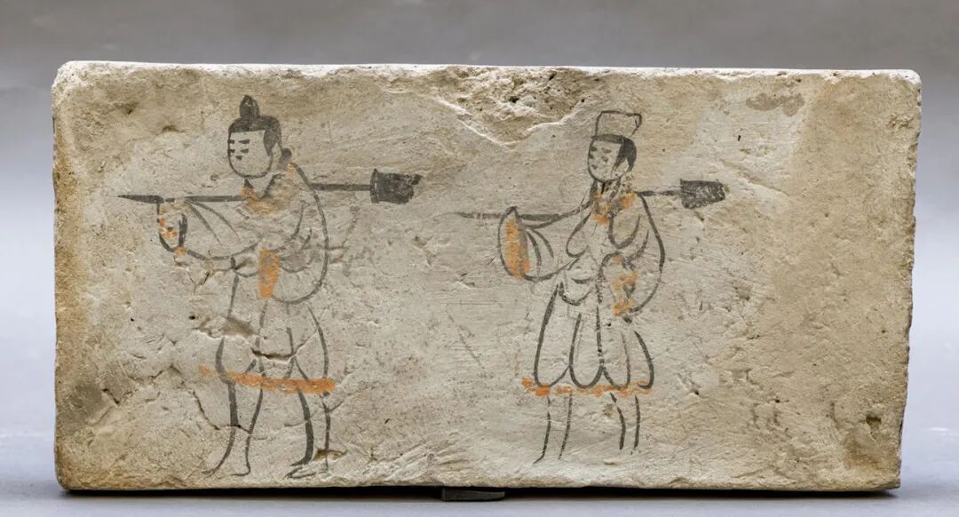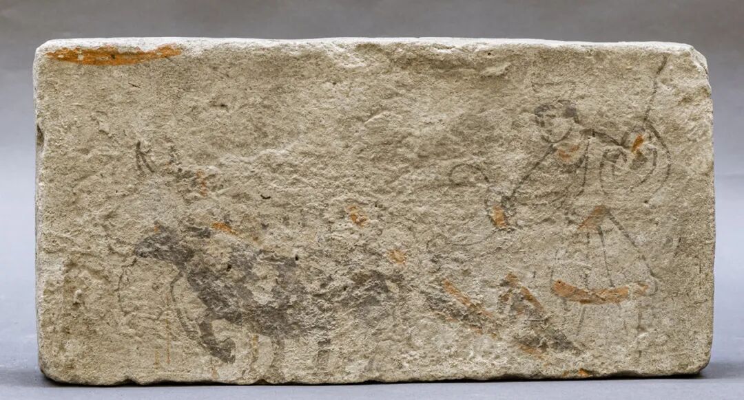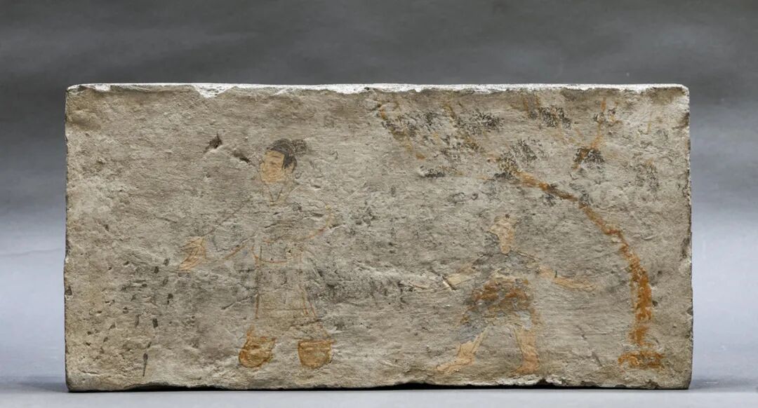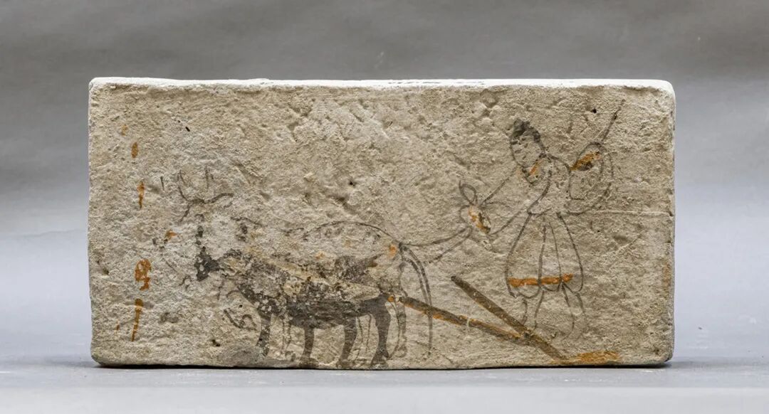 砖上绘一牛正在拉耙,牛前站立一人,深目高鼻,头发棰结,衣袍左祍,双手合抱,手中握有缰绳,怀中抱着一木棍状物。