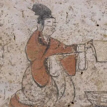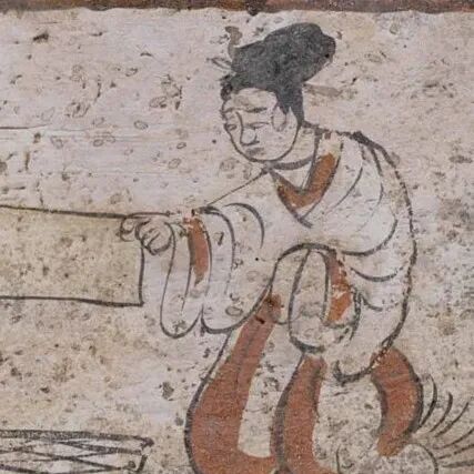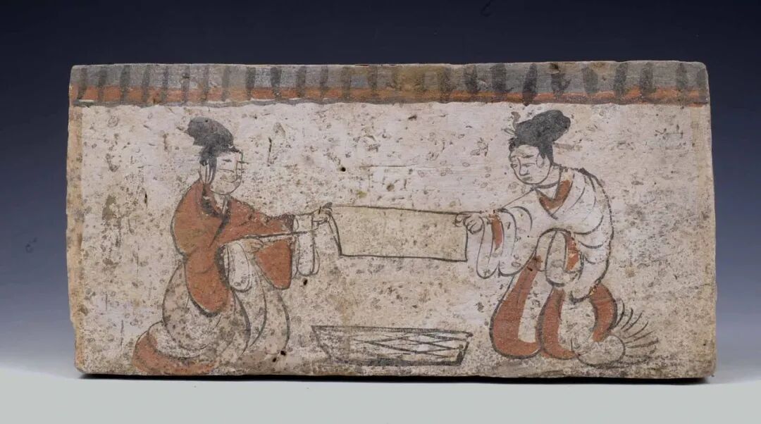砖上边缘以黑红两色绘屋檐,下绘两女子跪坐共扯一织物,织物下方放置一蓝色奁盒,图中两女子皆梳魏晋时期汉族妇女所崇拜的高髻,着右衽宽袖长衣,织物为两女所曳,右女持剪欲裁剪。女子手中所持的剪刀为“8”字状汉剪。生产工具是生产力发展水平高低的标志,仅从此图中女子手持的剪刀便可衡量当时河西地区丝织品加工技术所达到高度。在河西壁画中,裁剪题材较为少见,亦属珍罕。