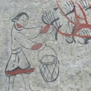 砖绘一女子左手持钩,右手提笼,正向桑树走去,准备采摘桑叶。在嘉峪关新城发掘的魏晋墓壁画中,采桑、丝束画较多,反映出桑蚕丝织生产在当时人们生产生活中的重要地位,是魏晋十六国时期河西走廊兴旺的桑蚕丝织业真实形象的历史写照。