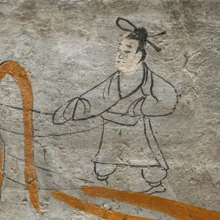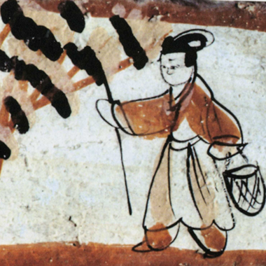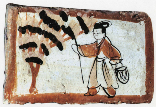 画面绘一女子提篮、赤足、采桑,对面男孩则手持弓箭正在驱赶偷吃桑叶的飞鸟。女子短发垂项,窄袖短衣,显然不是中原人,依据其着装特点可以推断其为龟兹人,龟兹即新疆库车一带。