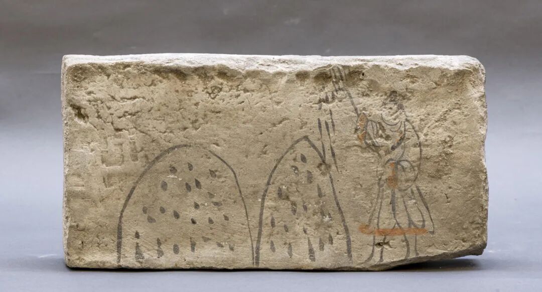 该砖左侧为一涂红粮仓,粮仓旁堆积四堆收获的粮食,其中有一堆涂红,其余三堆涂黑点,似是区分粮食种类的不同。