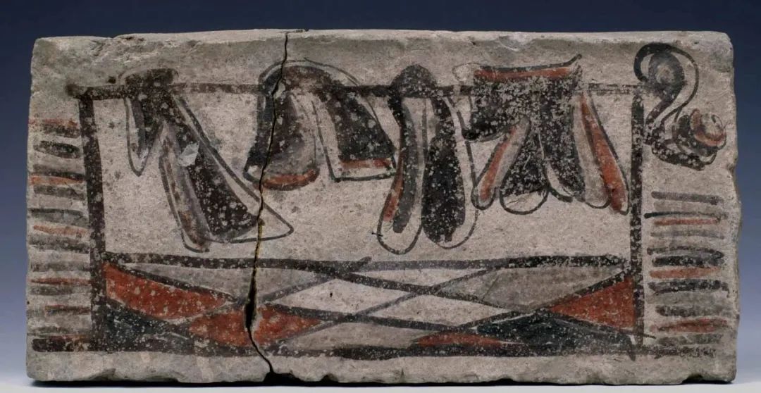 画砖白垩打底,墨线勾绘衣架,架底绘制网格纹,两侧画数道短线,架上晾晒衣物数件,反映了日常生活场景。画面红黑相间,热烈明快。