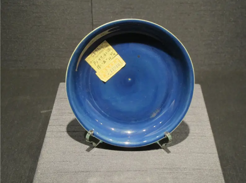 首都博物馆收藏着一件明嘉靖回青釉盘,撇口,浅腹,下塌底,圈足。底足修饰平整,足背露胎处有火石红痕迹。