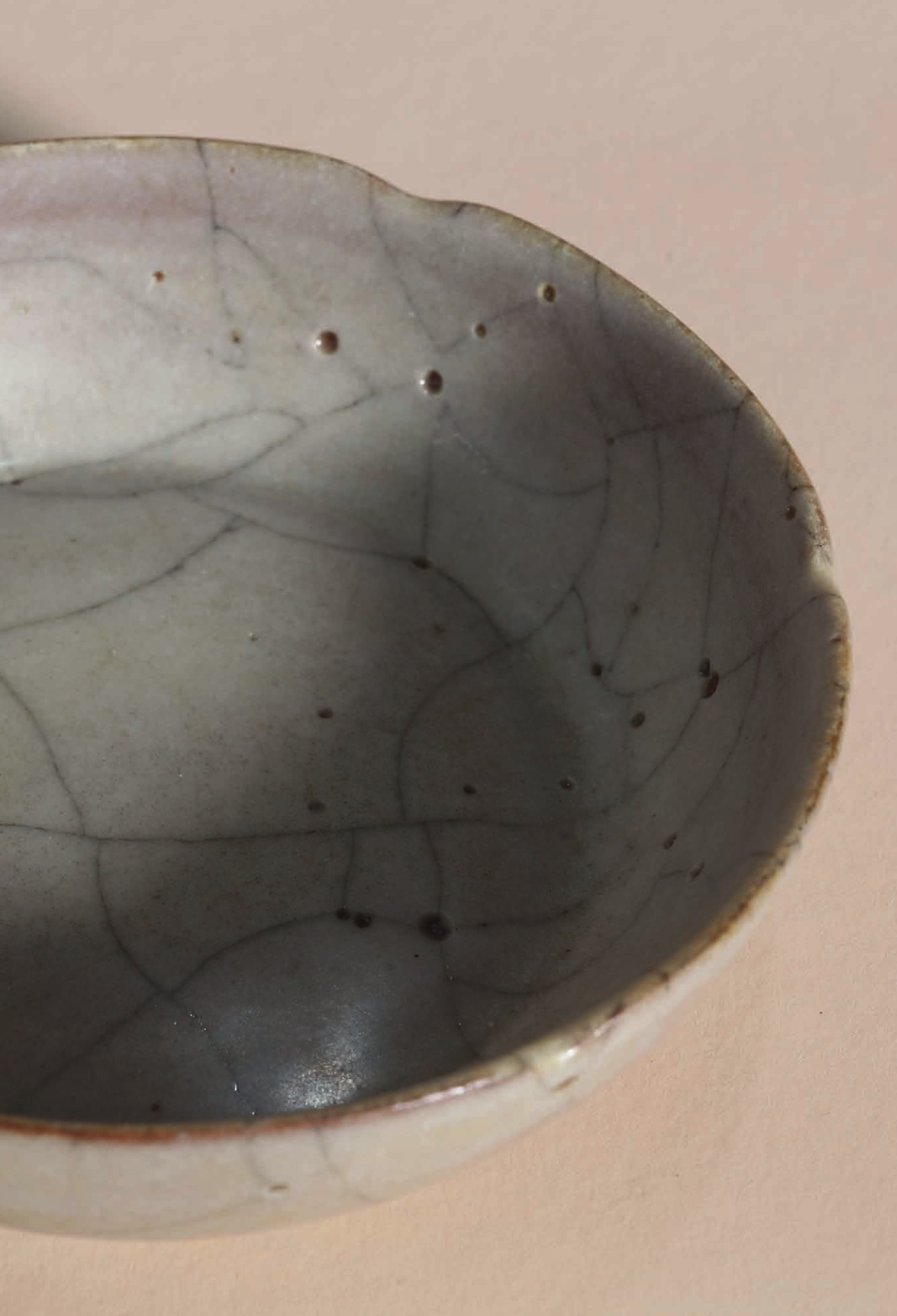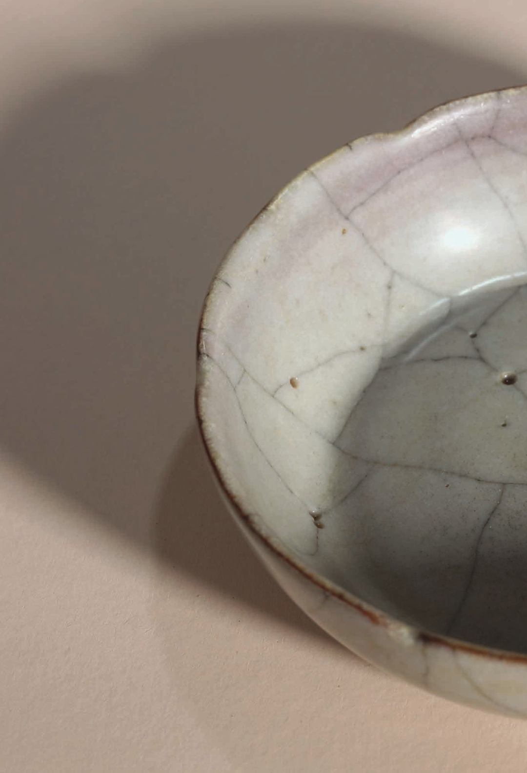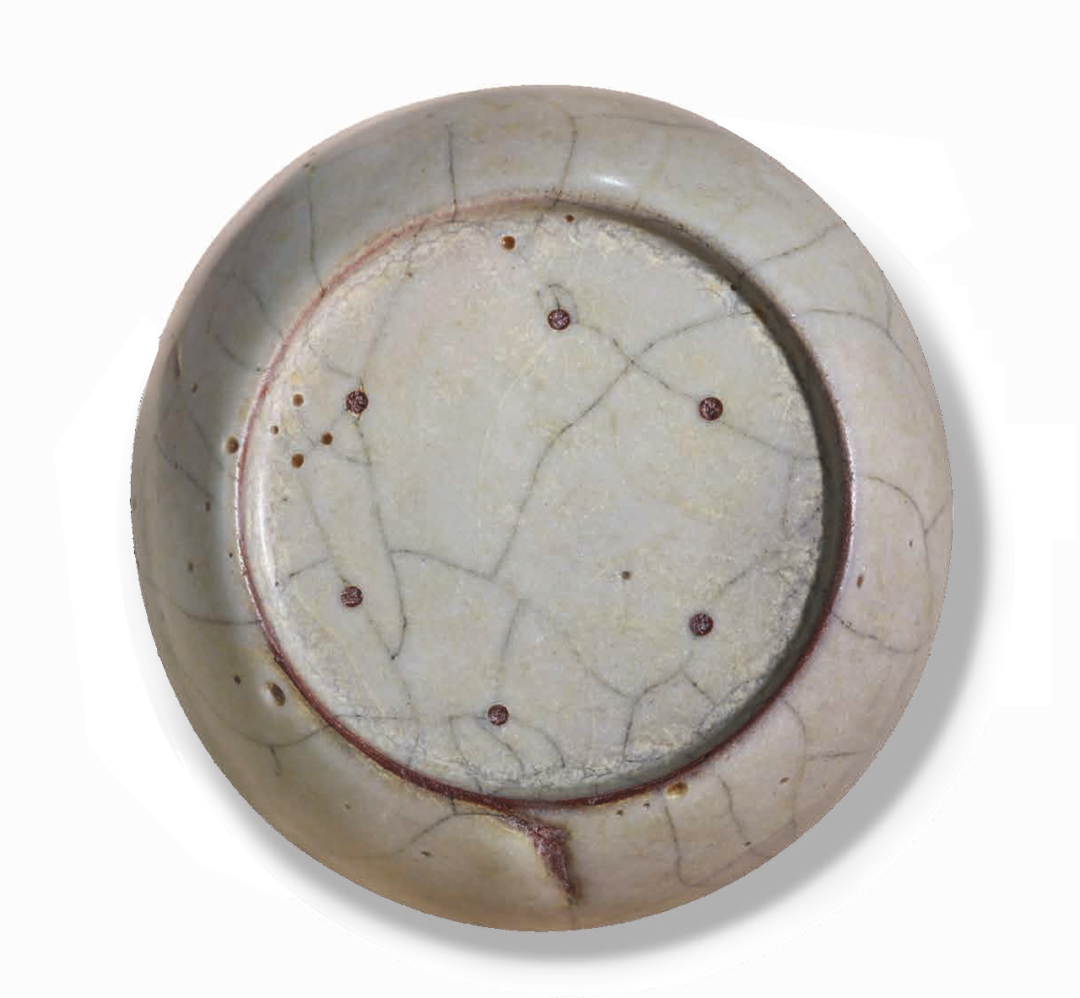 本品洗为六瓣葵花式,敞口,浅腹,侧看弯弧雍雅。棱角含蓄,器身随沿起伏,柔美绵延,简约雅绝。通体内外施釉米白微黄,呈现出乳浊的失透质感,釉汁肥厚匀润,色泽温润澄澈,釉表开细密纹片,开片带黑,自然相缀,浑然天成。口沿釉水流淌,釉层较薄,略呈紫褐色,隐隐露出釉层下灰黑胎体之色,正是宋窑器「紫口」的特征。底面亦上釉,轻微垂釉,十分自然,釉内多有气泡,如珠隐现,底有支钉痕六颗。