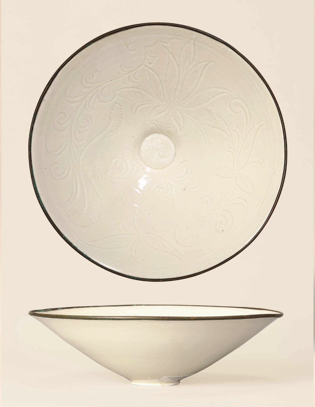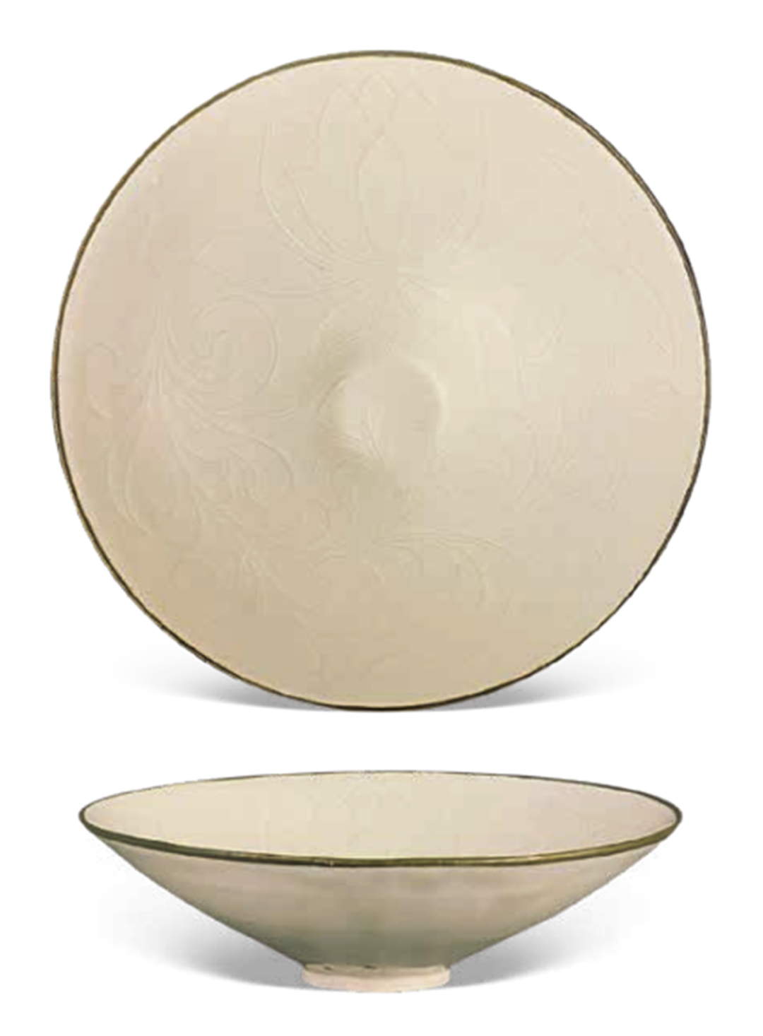 细观此器,敞口微侈,斜直腹下收至圈足,器形雅致隽美,俗称之“斗笠型碗”,定窑此类大口径的斗笠碗颇为罕见,寻常所见直径十几公分的斗笠型器物,因于斜直薄壁上施加刻划易使器壁烧塌,成型难度极大,而本件斗笠碗敞口尤甚,尺寸达 21 公分,更属难得。此器腹较浅,内壁以长斜刀配合直刀刻萱草纹,线条利落,流畅如画,使其无论是艺术性或是稀缺性,都是无与伦比的。原装铜镶口。