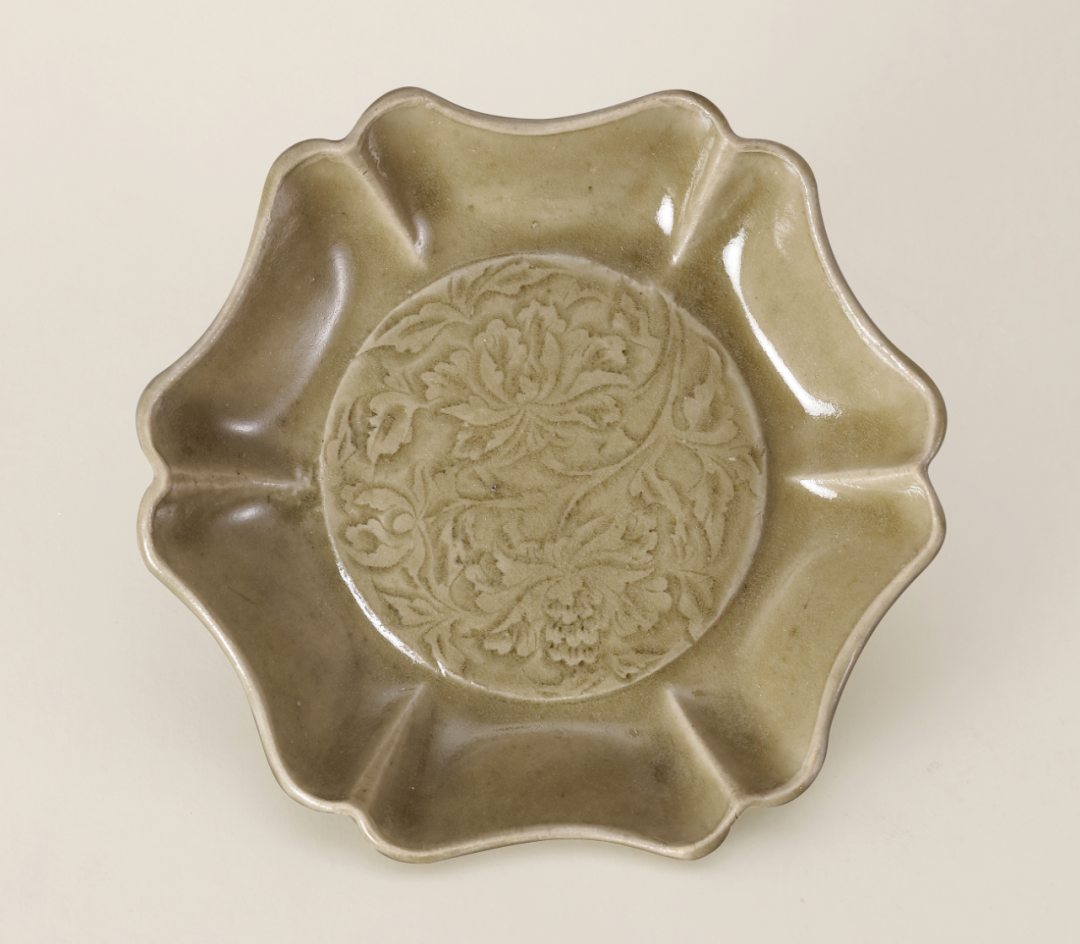 明青釉六出葵口刻花卉纹盘