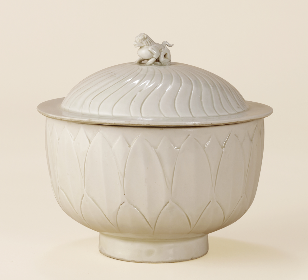 明白釉刻双层莲瓣纹狮纽盖碗