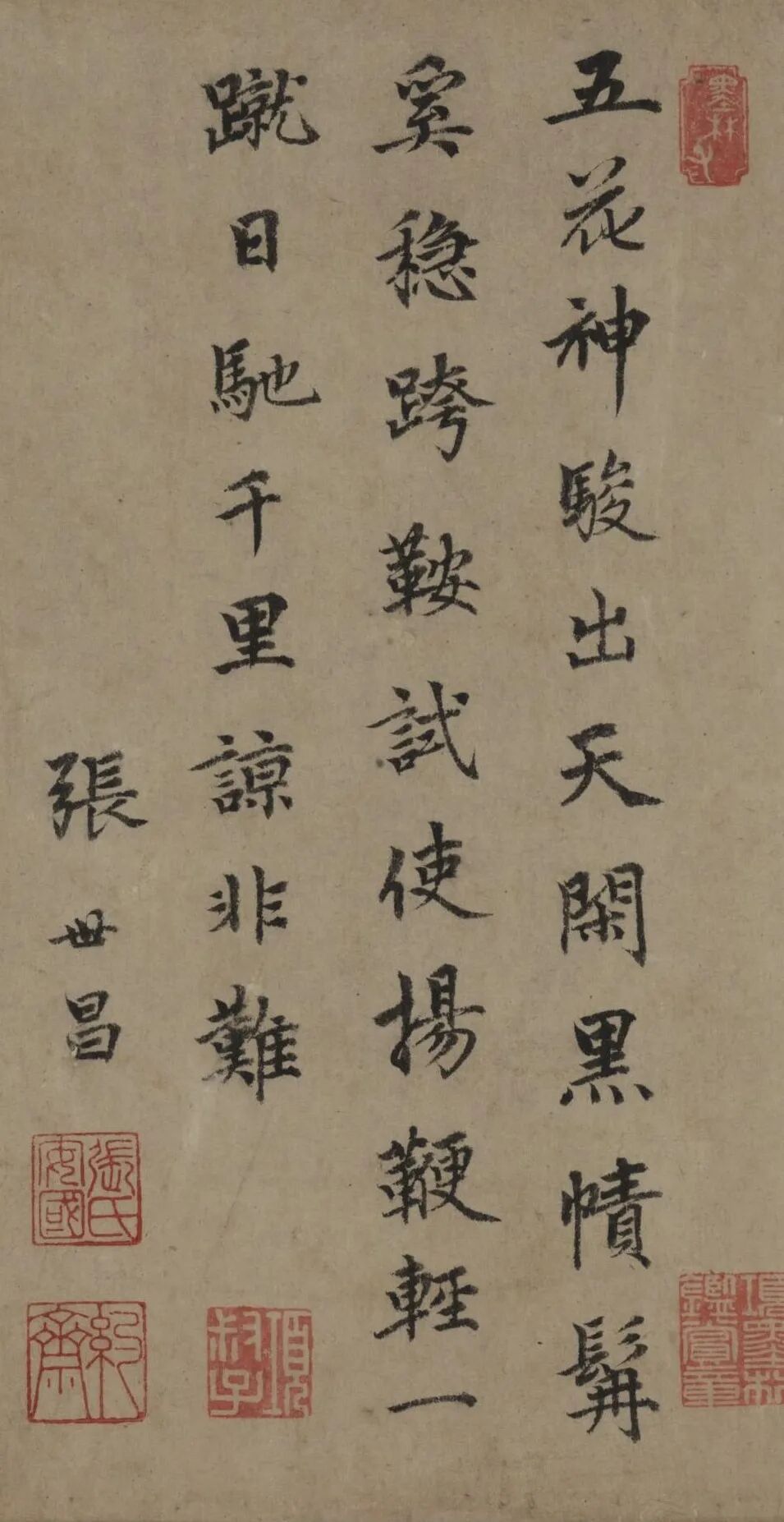 “五花神骏出天闲,黑帻髯奚稳跨鞍。试使扬鞭轻一蹴,日驰千里谅非难。张世昌。”