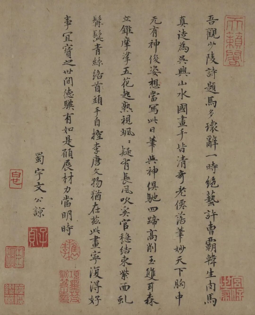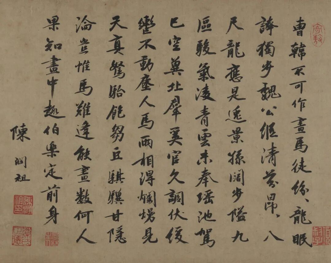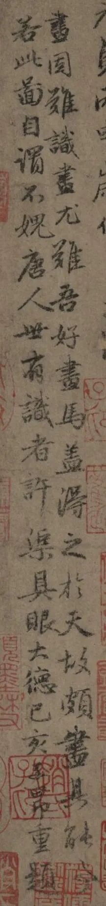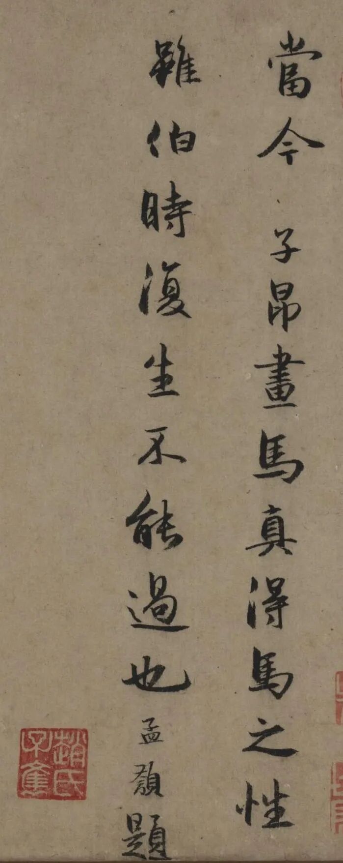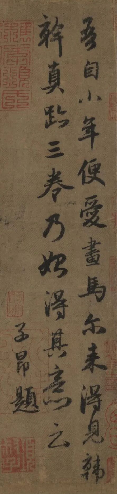 “吾自小年便爱画马,尔来得见韩干真迹三卷,乃始得其意云。子昂题。”