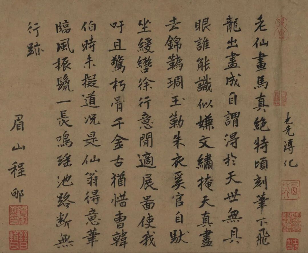 “老仙画马真绝特,顷刻笔下飞龙出。画成自谓得于天,世无具眼谁能识?似嫌文绘掩天真,尽去锦韀琱玉勒。朱衣奚官自驮坐,缓辔徐行意闲适,展图使我吁且惊,朽骨千金古犹惜。曹韩伯时未拟道,况是仙翁得意笔。临风振鬃一长鸣,瑶池路断无行迹。眉山程郇。”